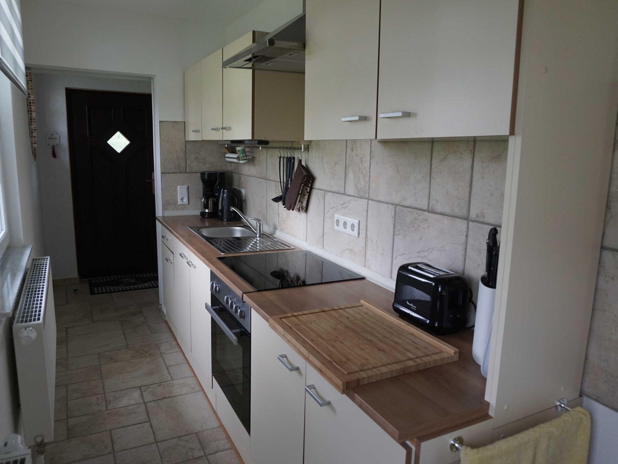 - zum Wohnraum offene Küche mit Ceranfeld, Backofen, Kühl-Gefrierkombination, Toaster, Wasserkocher,Mikrowelle