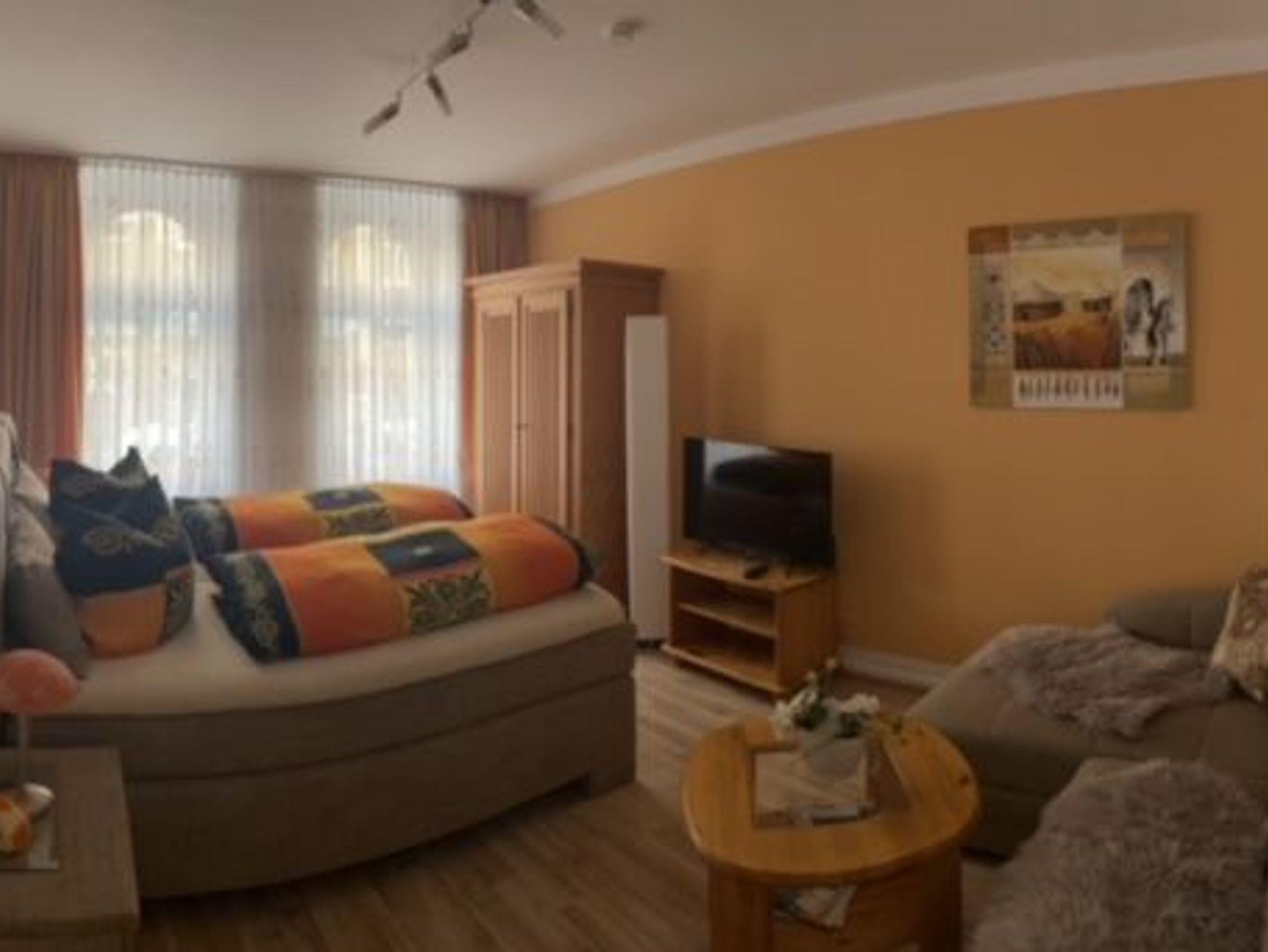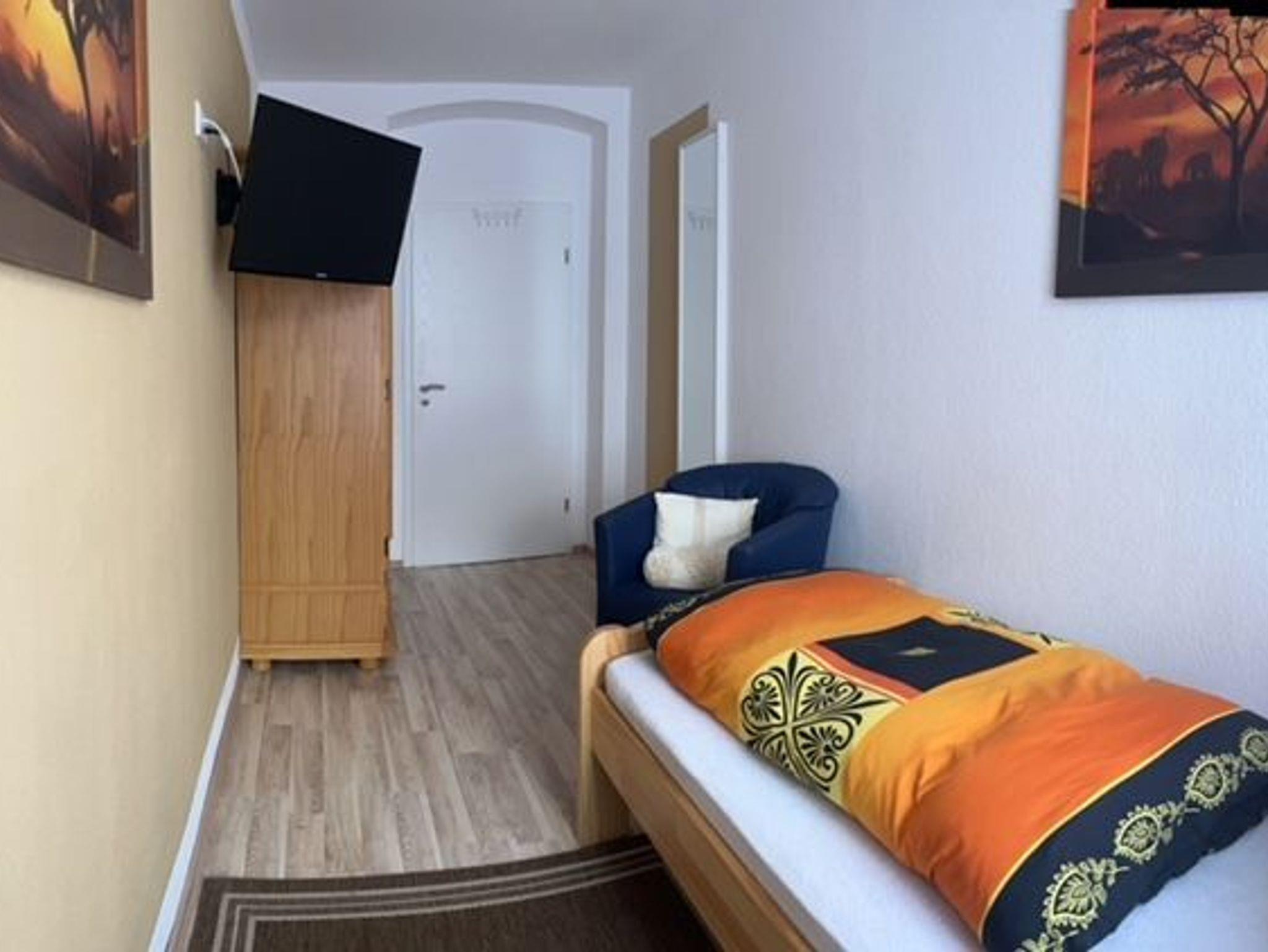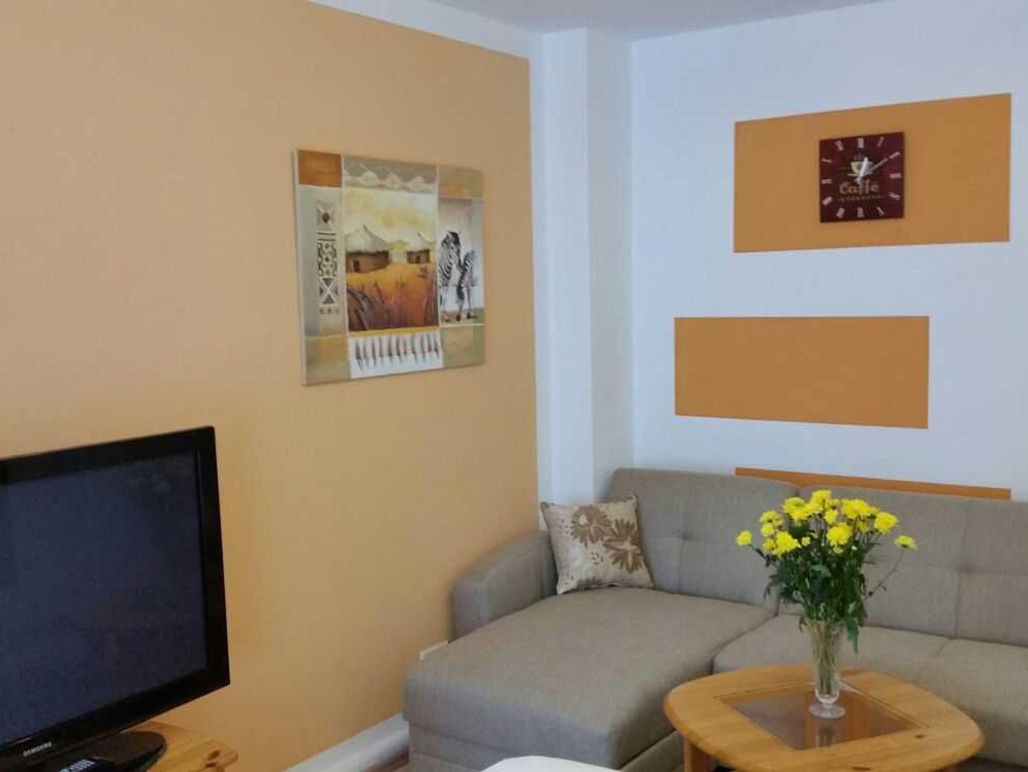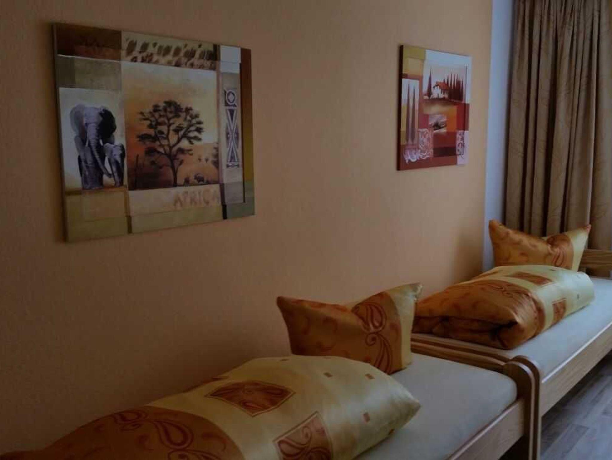 Das kombinierte Wohn/Schlafzimmer ist mit einem Boxspringbett (Maße 1,80 mx 2m) sowie einer kleinen Eckcouch und einem TV ausgestattet. Im zweiten Schlafzimmer stehen 2 getrennte Betten. Das dritte Zimmer verfügt über ein Einzelbett.