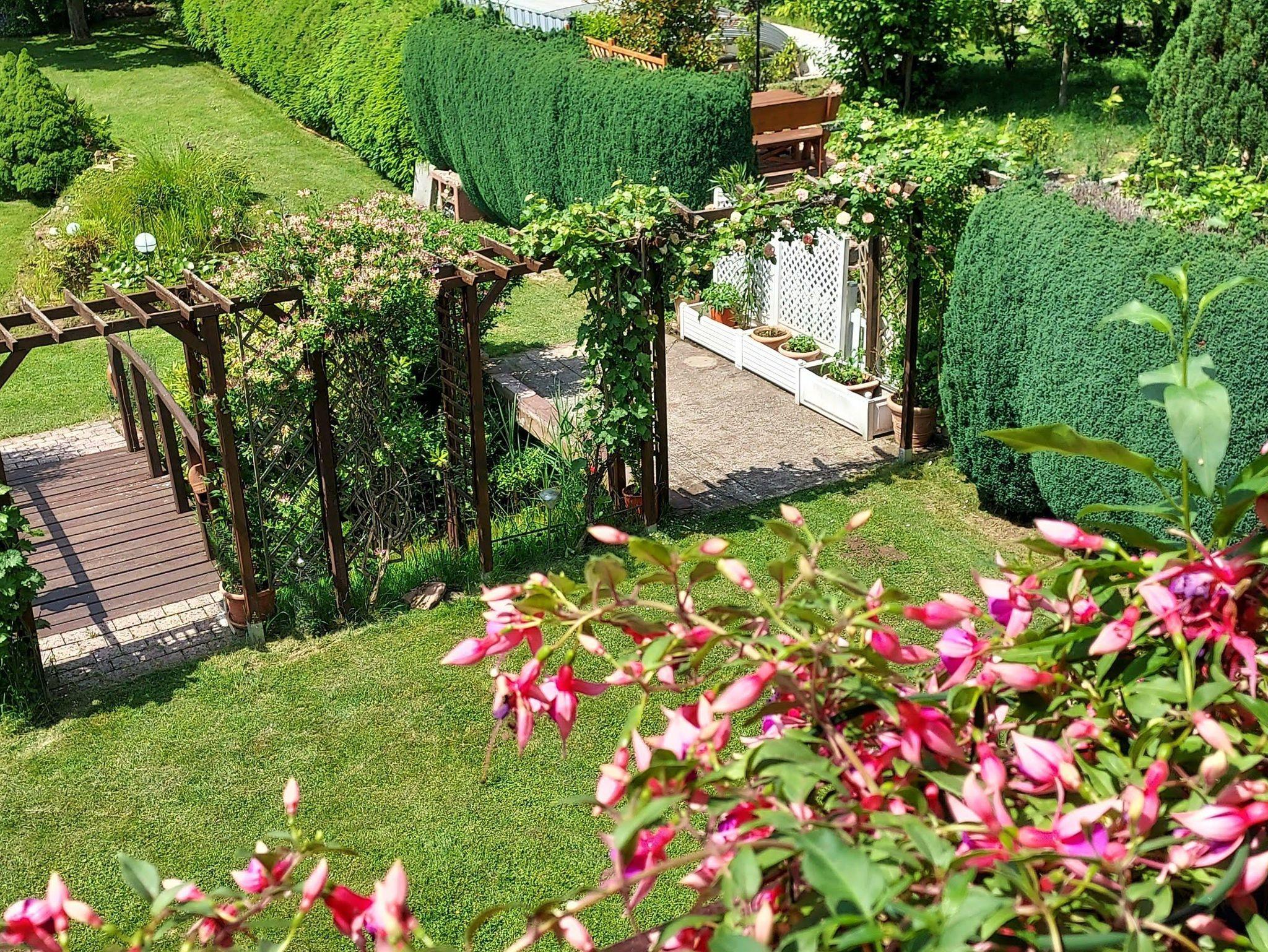 Genießen Sie den Blick vom großen Balkon in den großen Blumengarten im Wechsel des Lichts.