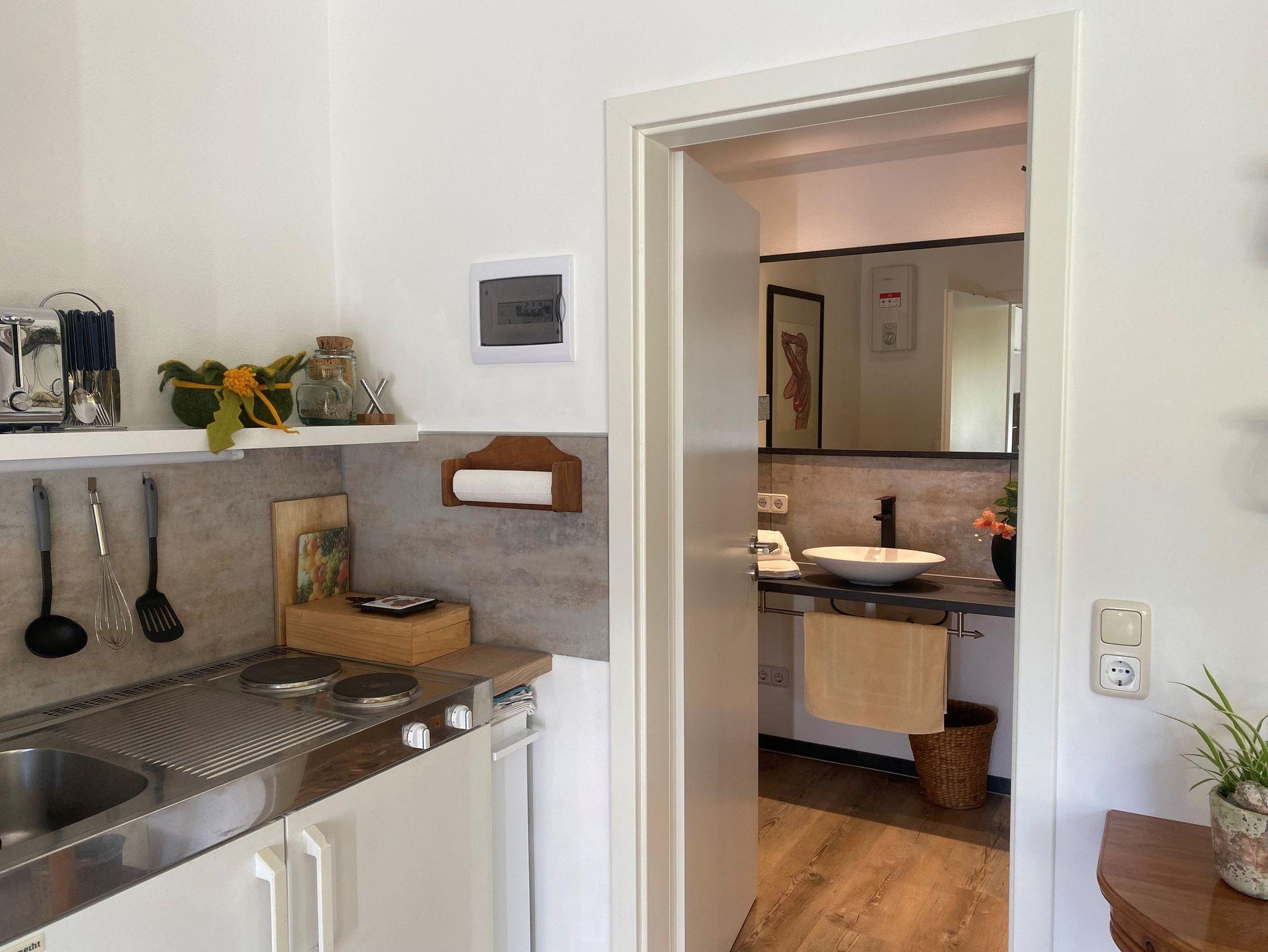 Herzlich willkommen- Ein eigener Zugang in Ihr helles, großzügig gestalteten Garten-Apartment. Sie finden einen großen Garderoben-Schrank mit Spiegel. Eine Küchenzeile mit Kühlschrank und komplette Ausstattung wie: Mikrowelle, Klein Backofen und Basis-Lebensmittel(Zucker, Salz & Pfeffer, Essig/Öl, Nudeln).