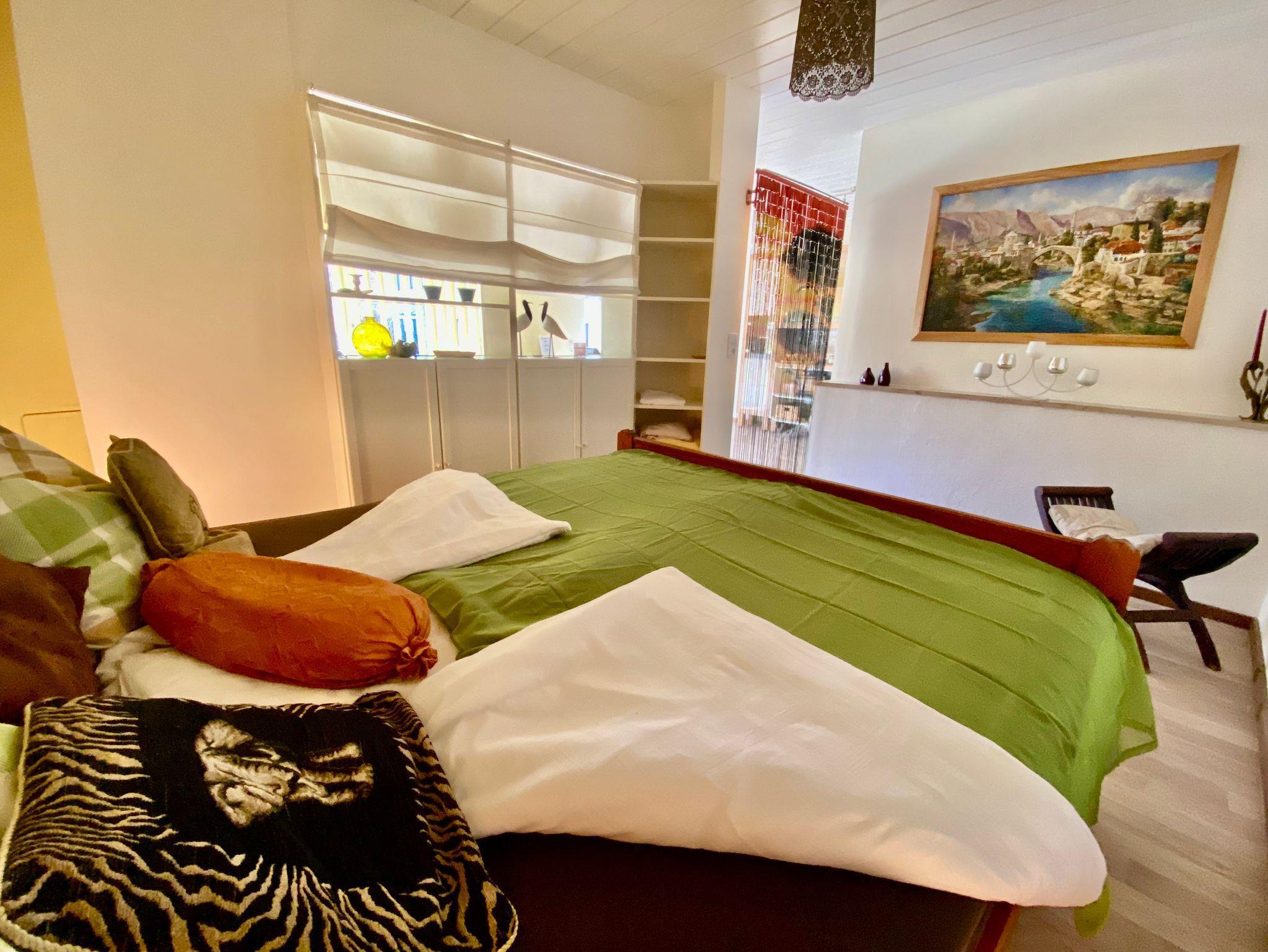 Das anschließende Schlafzimmer ist mit einem großen Doppelbett und einer Schrankwand zum Wohnzimmer getrennt.