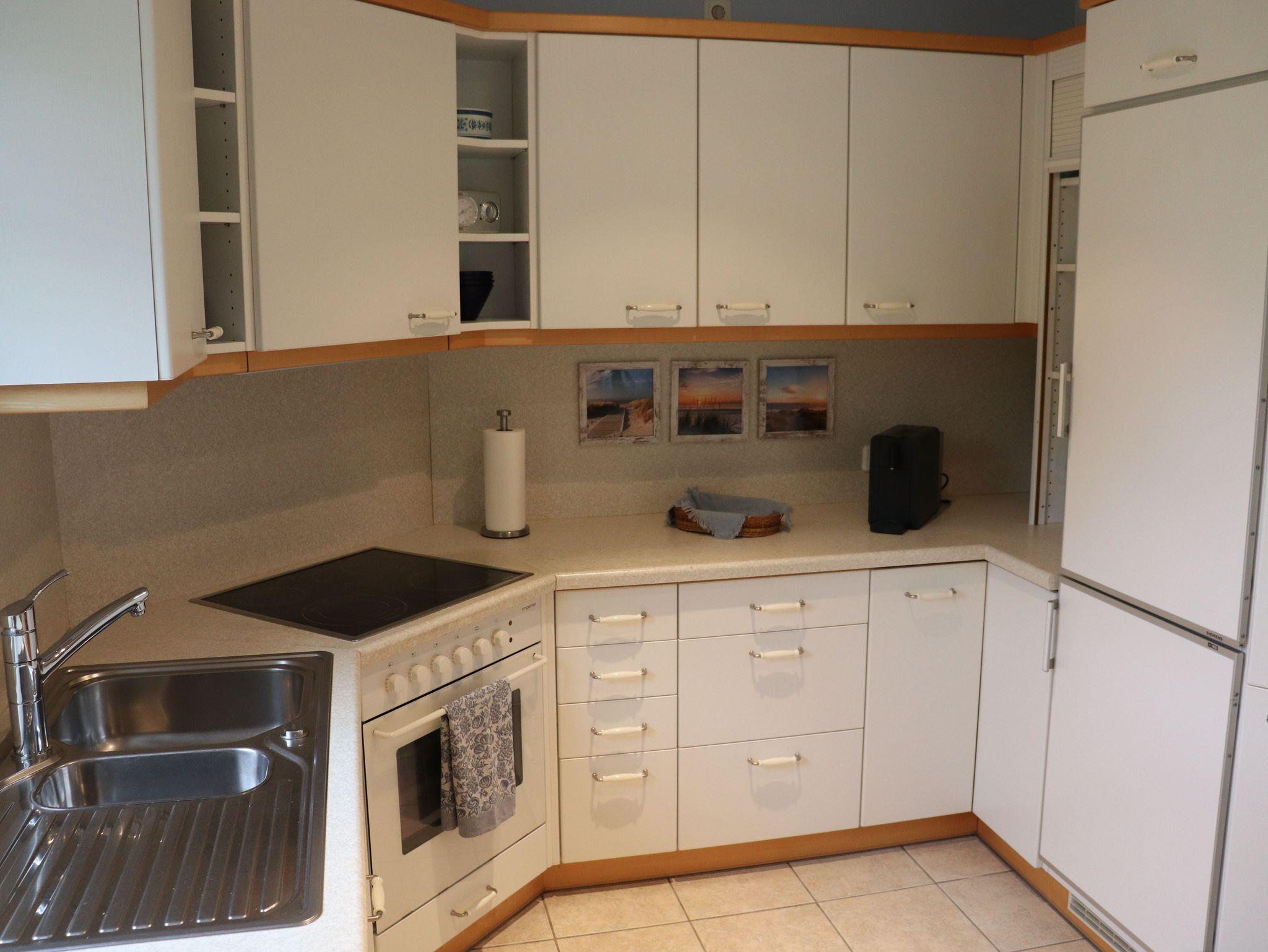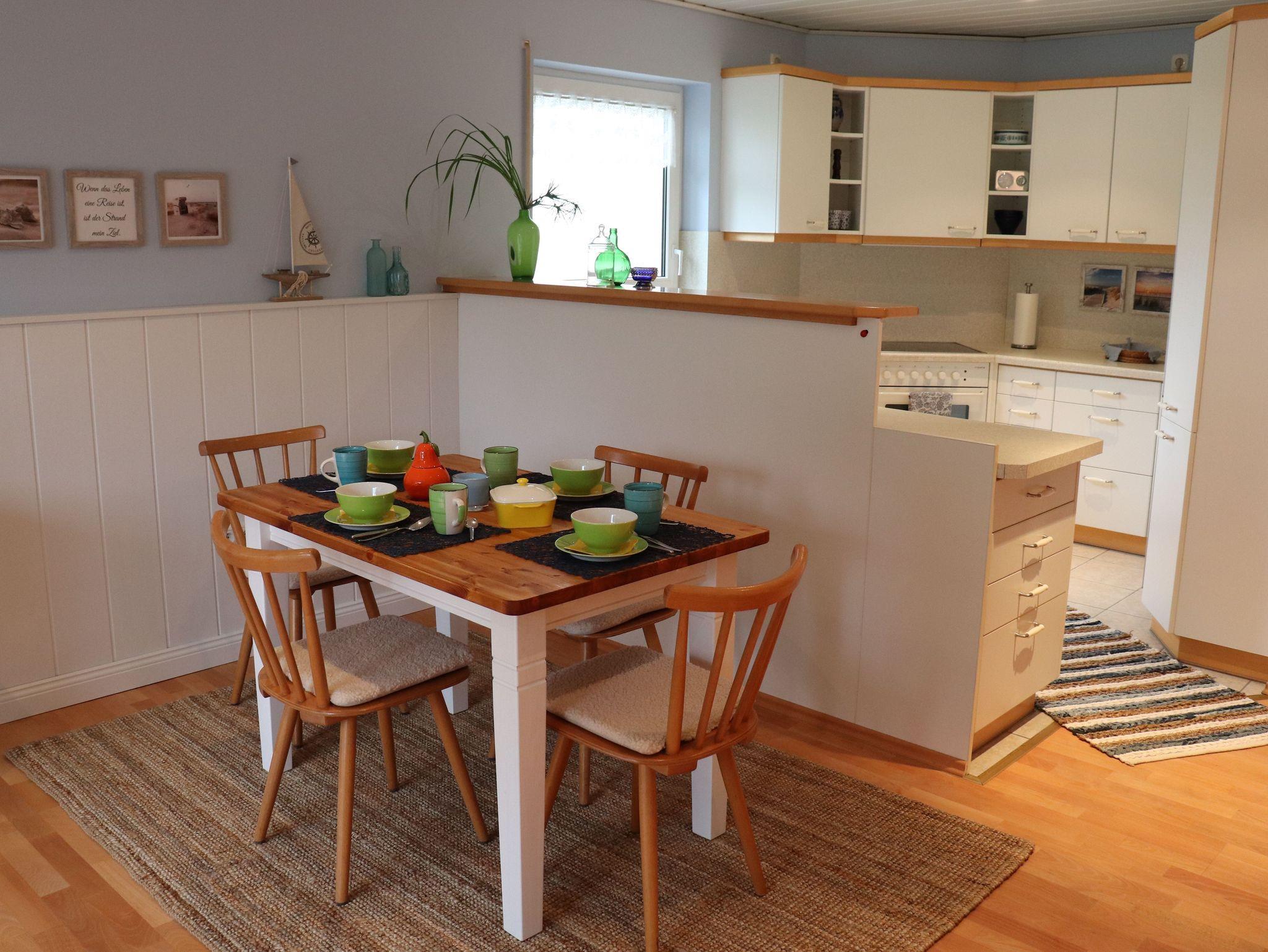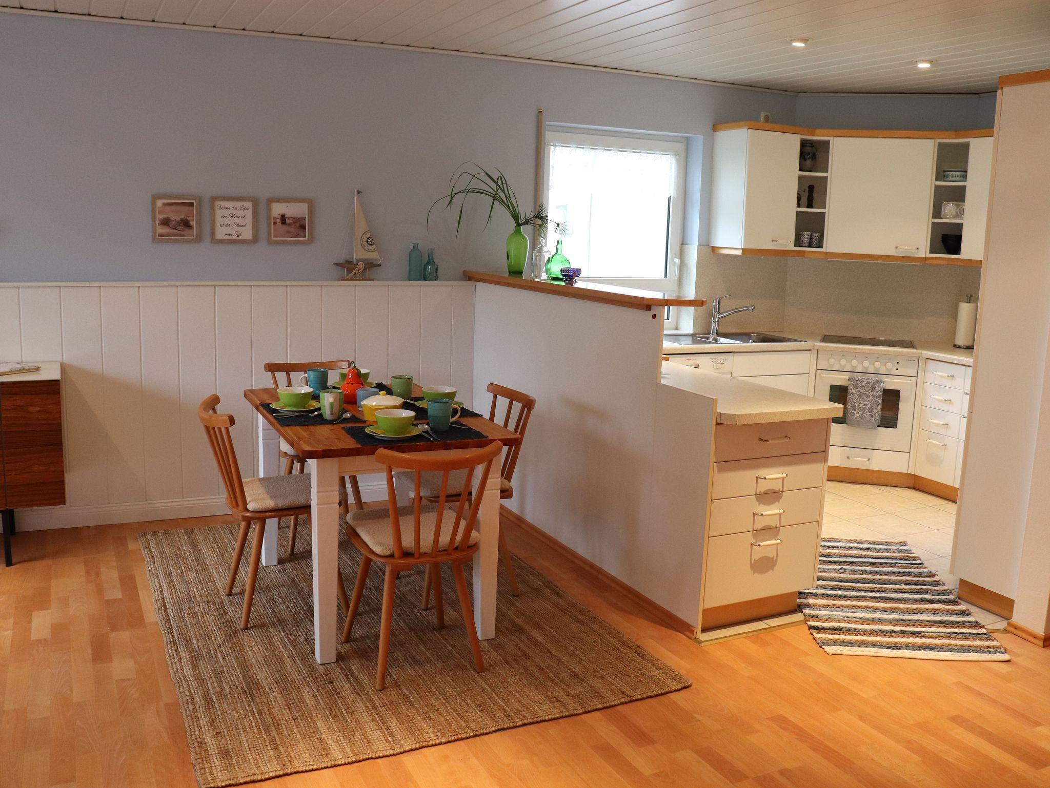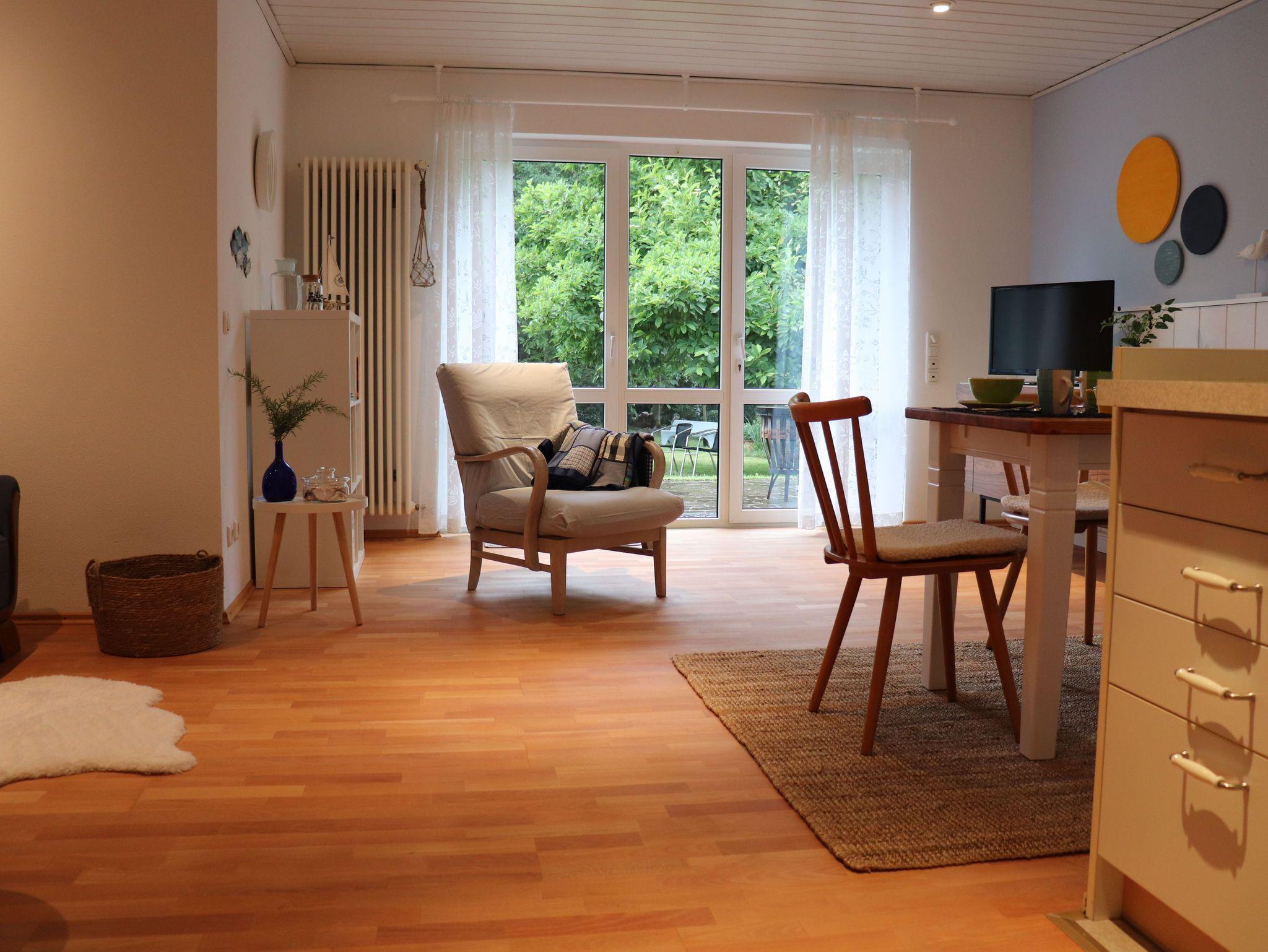 Der im Erdgeschoss befindliche Wohn- und Essbereich mit TV neben der offenen, voll ausgestatteten Küche bietet einen wunderbaren Blick in den Garten mit vorliegender Sonnenterrasse.