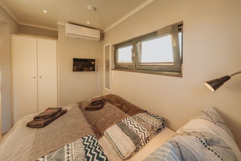 Das Hausboot „Enola“ besitzt 1 Schlafzimmer mit einem Doppelbett und ein Schlafzimmer mit einem Etagenbett. Im Wohnbereich befindet sich ein Schlafsofa. Dieses bietet Platz für eine weitere Person. Das Badezimmer ist mit einer Dusche, WC und Waschtisch ausgestattet. Der Wohn- und Essbereich ist ein stilvoll eingerichteter Raum mit einer dreiseitigen Glasfront.