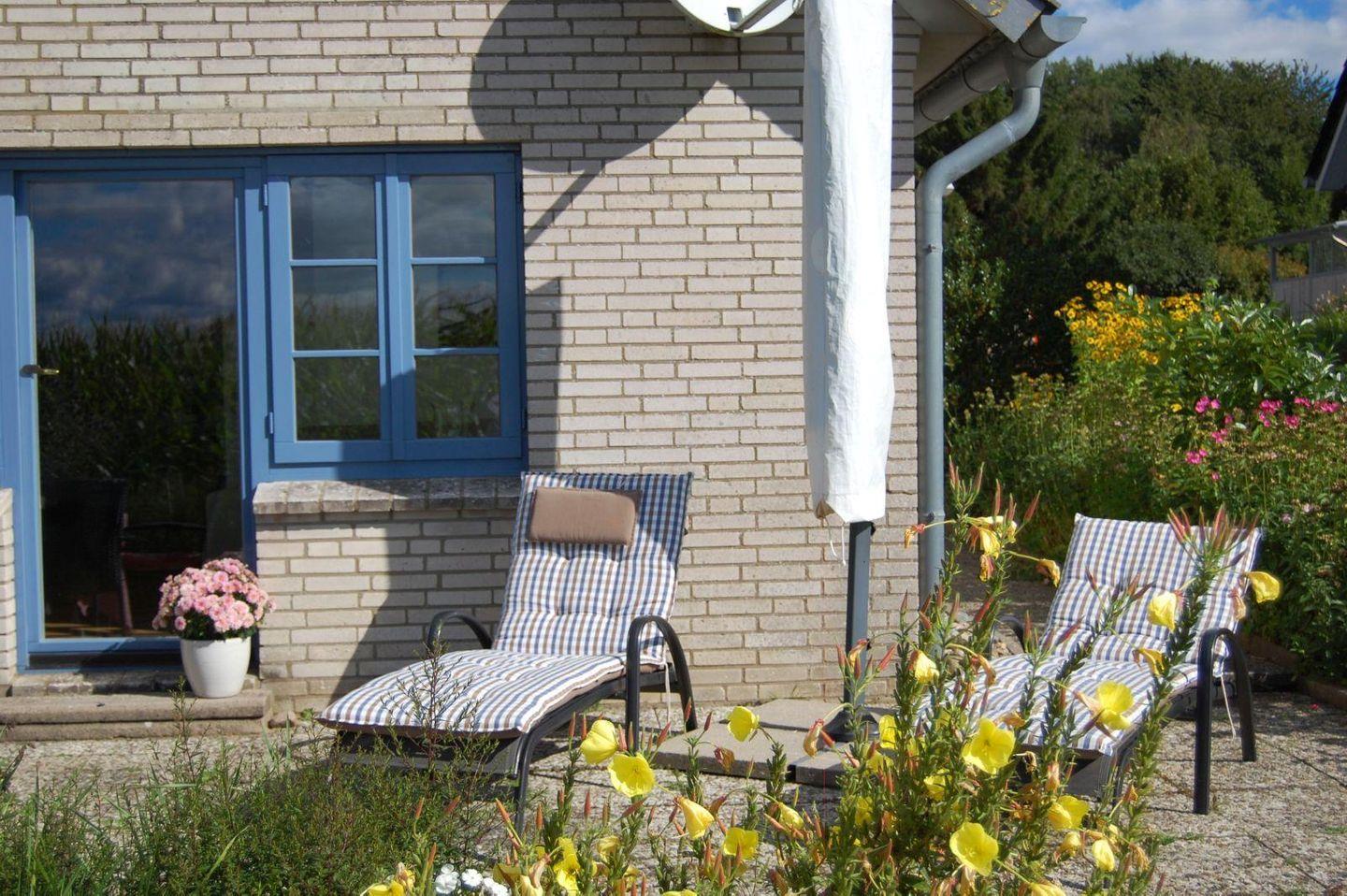 Hinter dem Haus ist die sonnige Südterrasse mit einer Sitzgruppe, auch zwei Liegen laden zum Relaxen ein. Die angrenzende Rasenfläche ist prima geeignet, um einen Logenplatz mit Blick auf die Felder und die Schlei zu finden.