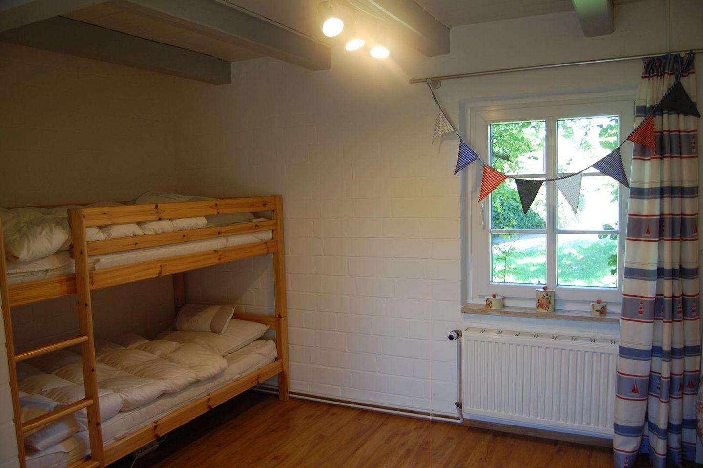 Bis zu vier Erwachsene und ein Kind oder drei Erwachsene und zwei Kinder können hier Urlaub machen und das freundliche Ambiente genießen. Der offene Küchen- und Essbereich grenzt an den gemütlichen Wohnbereich mit hoher Balkendecke und bietet einen fantastischen Blick über die Felder und aufs Wasser. Im Erdgeschoss gibt es neben dem Badezimmer mit Dusche, WC und Waschmaschine auch ein Schlafzimmer. Ein Etagenbett und ein Einzelbett, sowie ein kleiner Tisch mit Stühlen für Kinder und ein Schrank bieten hier ausreichend Platz. Über die kleine Treppe erreicht man das obere großzügige offene Schlafzimmer. Hier gibt es auch einen kleinen Schreibtisch mit Wasserblick, ein großes Doppelbett und zwei Schränke.