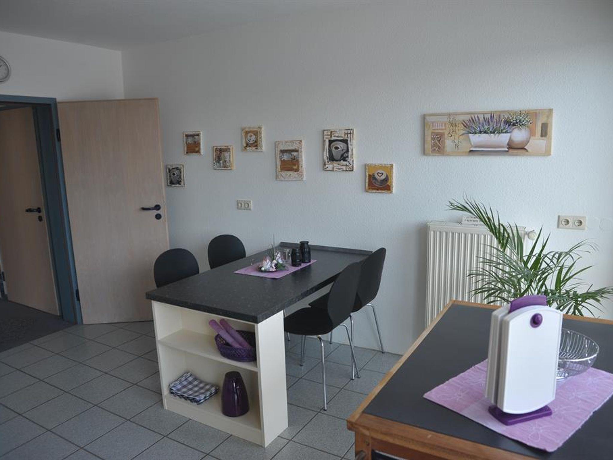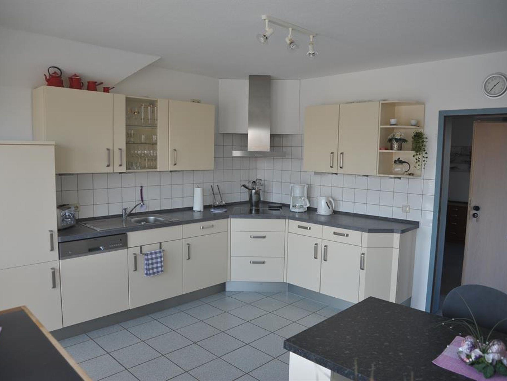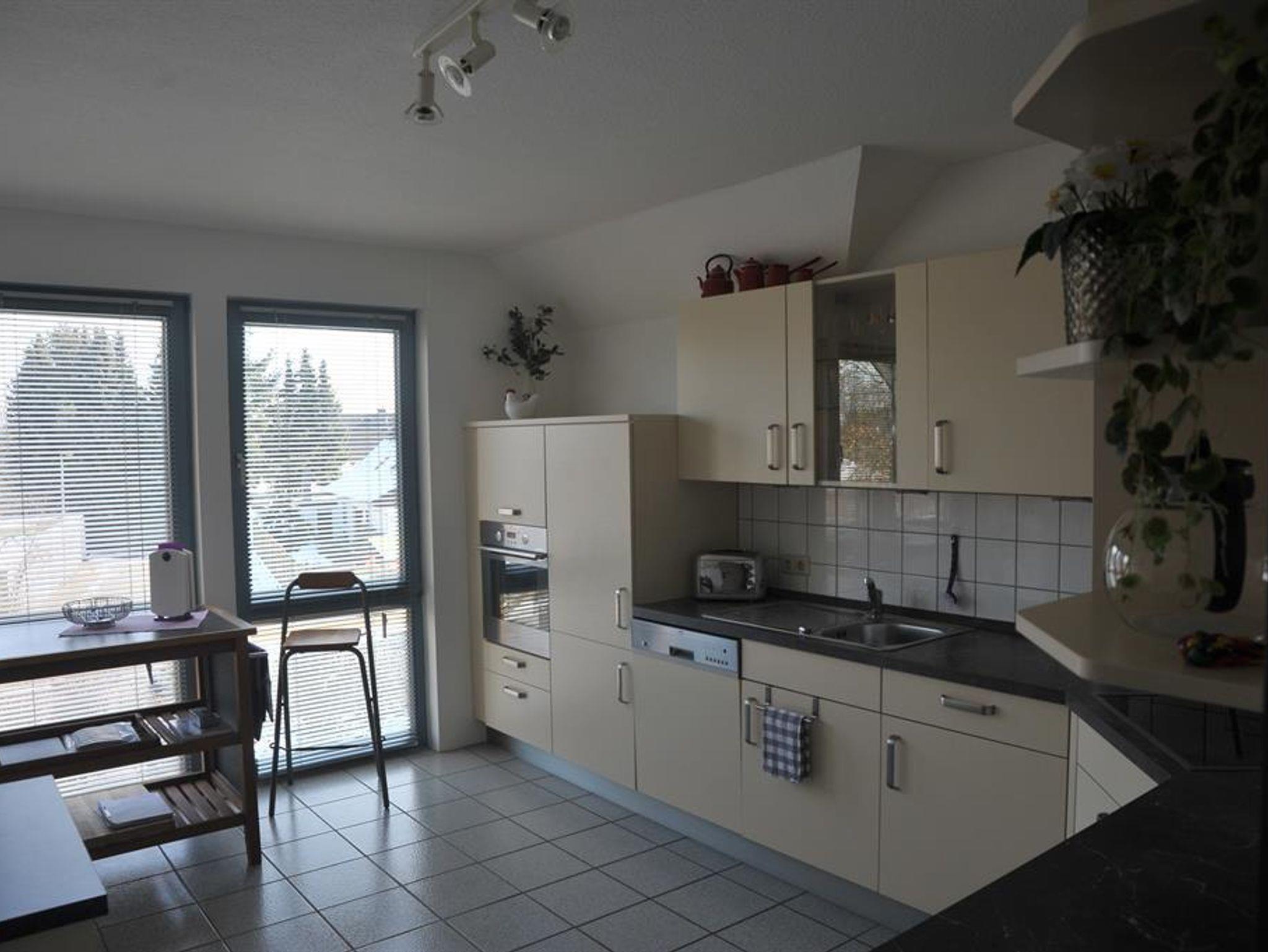 1 voll ausgestattete Einbauküche mit Geschirrspüler, Kühlschrank mit Gefrierfach, Mikrowelle, Cerankochfeld, Backofen, Wasserkocher, Kaffeemaschine, Toaster, Handmixer, Esstisch für mind. 4 Personen.