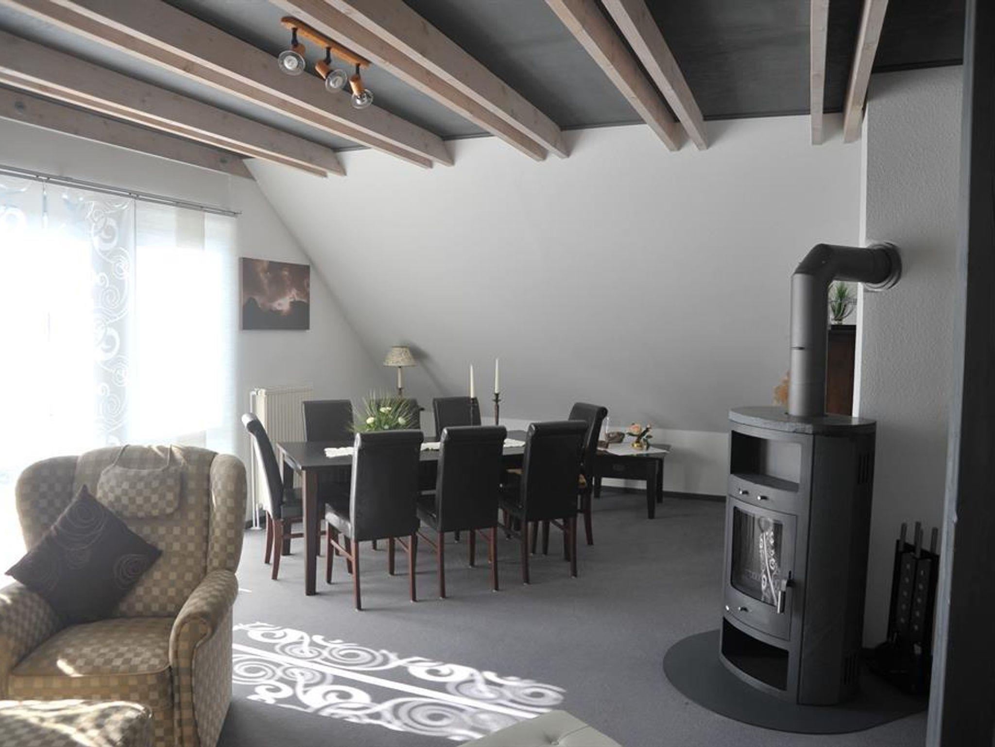 1 gr. Wohnzimmer mit Esstisch für 6 Pers., Sitzgruppe, Fernsehsessel, TV, CD-Player, DVD-Player, Kaminofen.