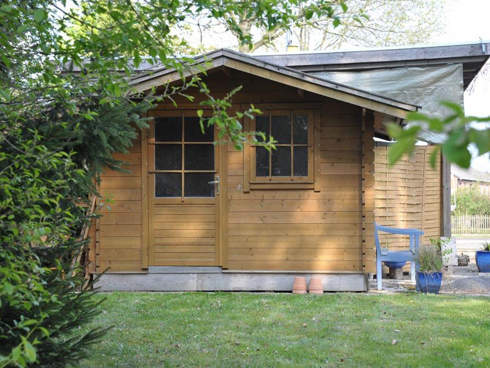 Eine Blockhütte mit Gartenmöbeln steht auf unserem 2500 qm großen Grundstück zum Entspannen für Sie bereit.