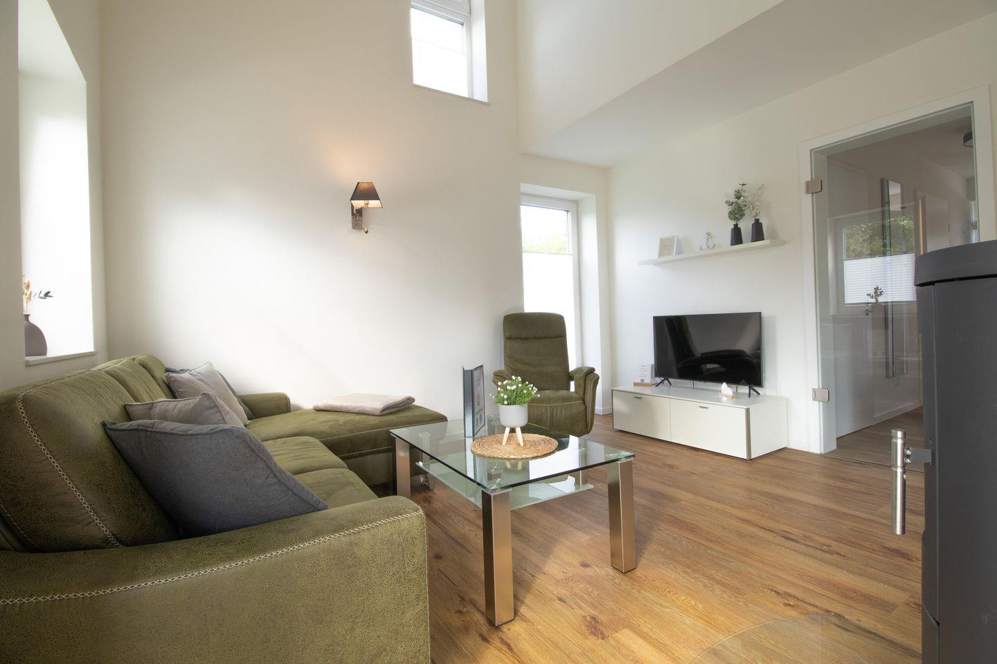 Im großzügigen Wohnbereich mit Kaminofen kannst du herrlich entspannen – ob bei einem Buch, einem Film oder einfach dem Blick ins Freie. Die offene Küche mit großem Esstisch ist voll ausgestattet und lädt zu gemeinsamen Mahlzeiten ein. Für zusätzliche Schlafmöglichkeiten steht eine komfortable Schlafcouch bereit. Bodentiefe Fenster und die Galerie sorgen für ein helles, offenes Raumgefühl. Von der überdachten Terrasse mit Sonnenschutz genießt du sonnige Frühstücke oder entspannte Abende im Freien.