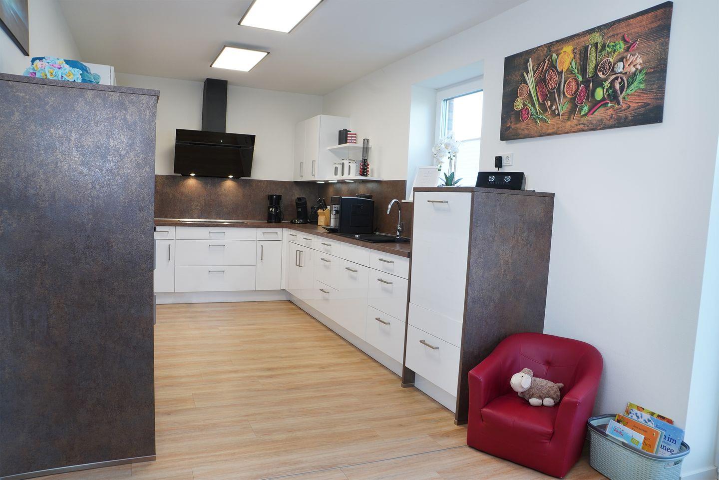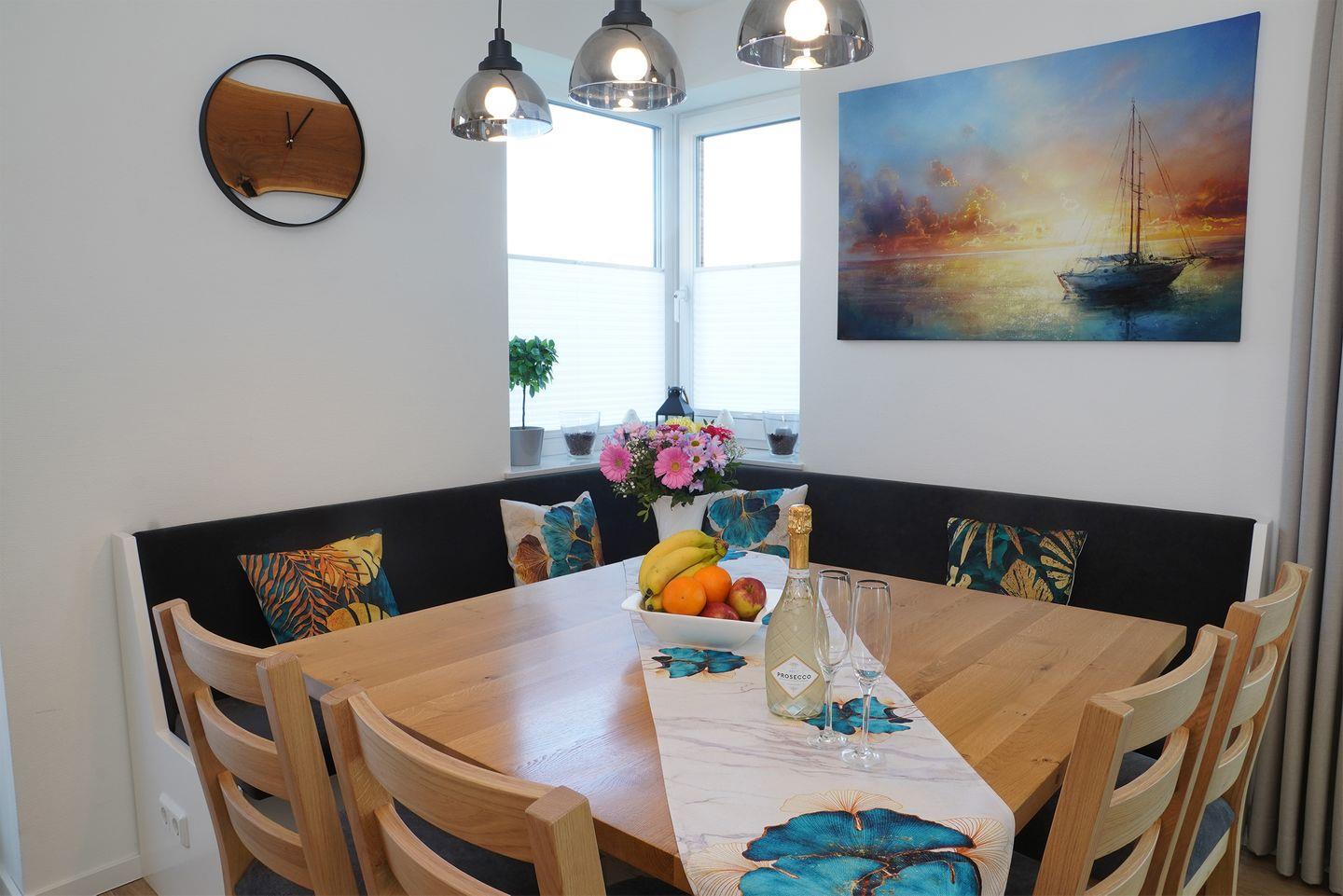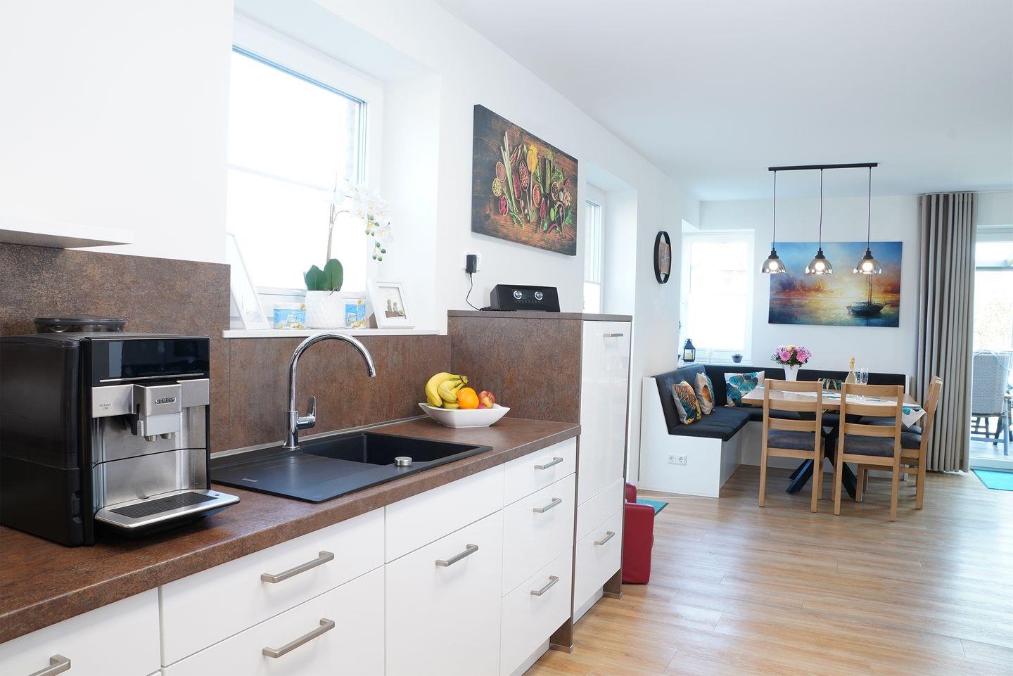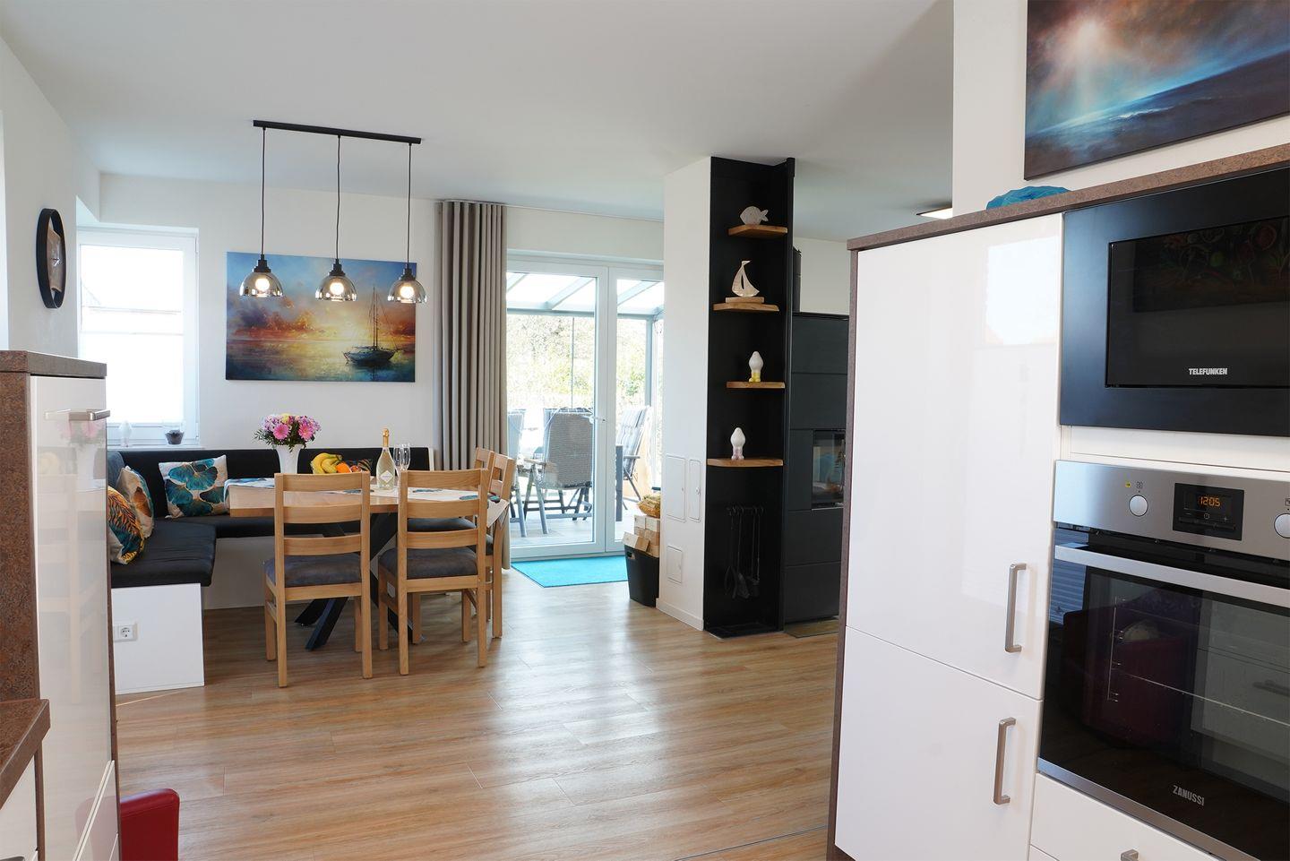 Im Erdgeschoss erwartet dich ein großzügiger Wohn- und Essbereich mit Holzkamin. Für deinen Aufenthalt liegt ausreichend Kaminholz für den Start bereit. Die große U-Küche bietet viel Arbeitsfläche und eine gemütliche Eckbank für gemeinsame Mahlzeiten. Zur Ausstattung gehören Kaffeevollautomat, Küchenmaschine, Waffeleisen und Mikrowelle. Hier kochst du entspannt für mehrere Personen.