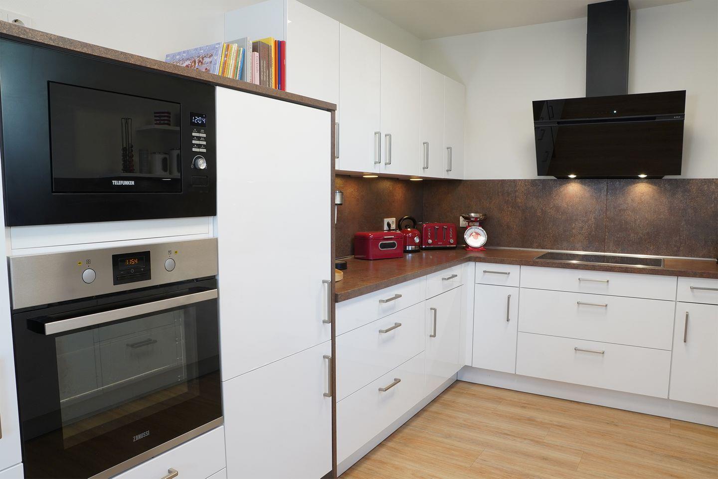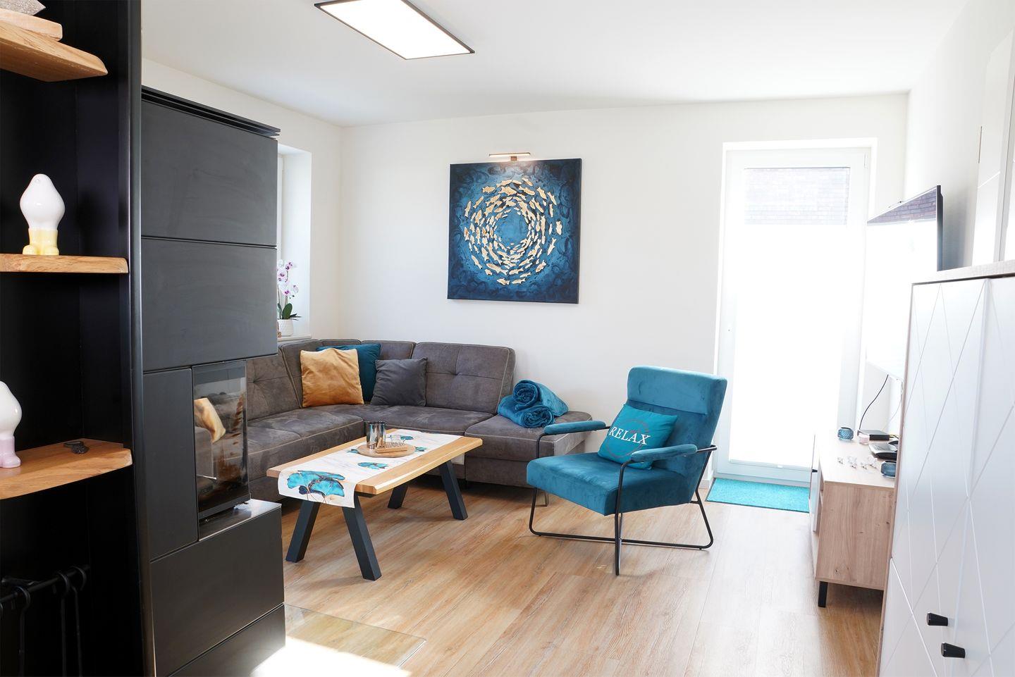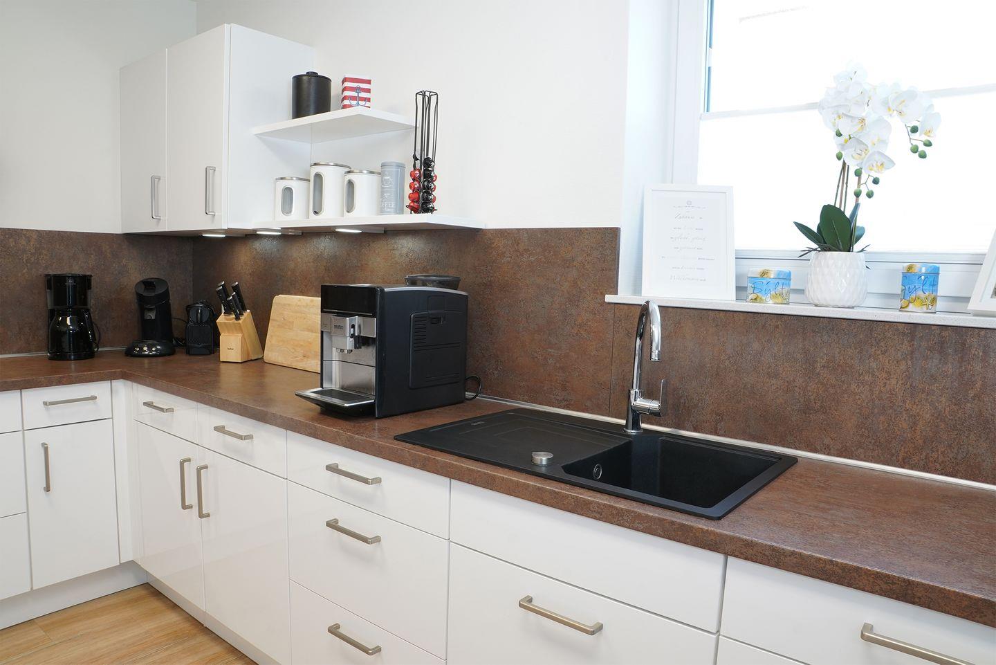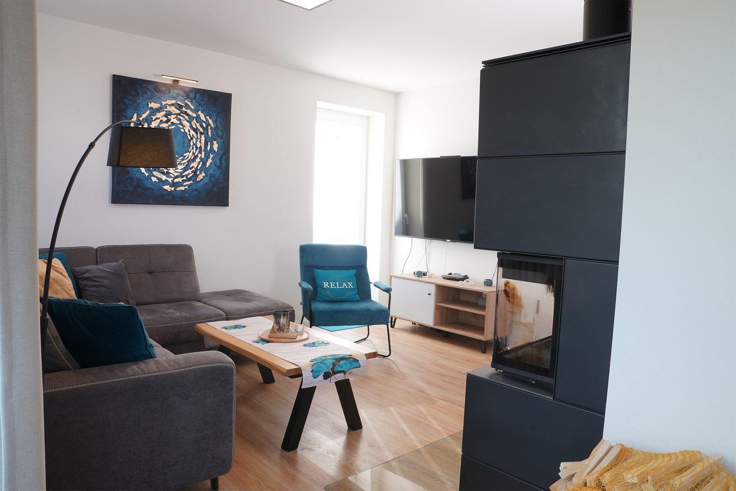 Im Erdgeschoss erwartet dich ein großzügiger Wohn- und Essbereich mit Holzkamin. Für deinen Aufenthalt liegt ausreichend Kaminholz für den Start bereit. Die große U-Küche bietet viel Arbeitsfläche und eine gemütliche Eckbank für gemeinsame Mahlzeiten. Zur Ausstattung gehören Kaffeevollautomat, Küchenmaschine, Waffeleisen und Mikrowelle. Hier kochst du entspannt für mehrere Personen.