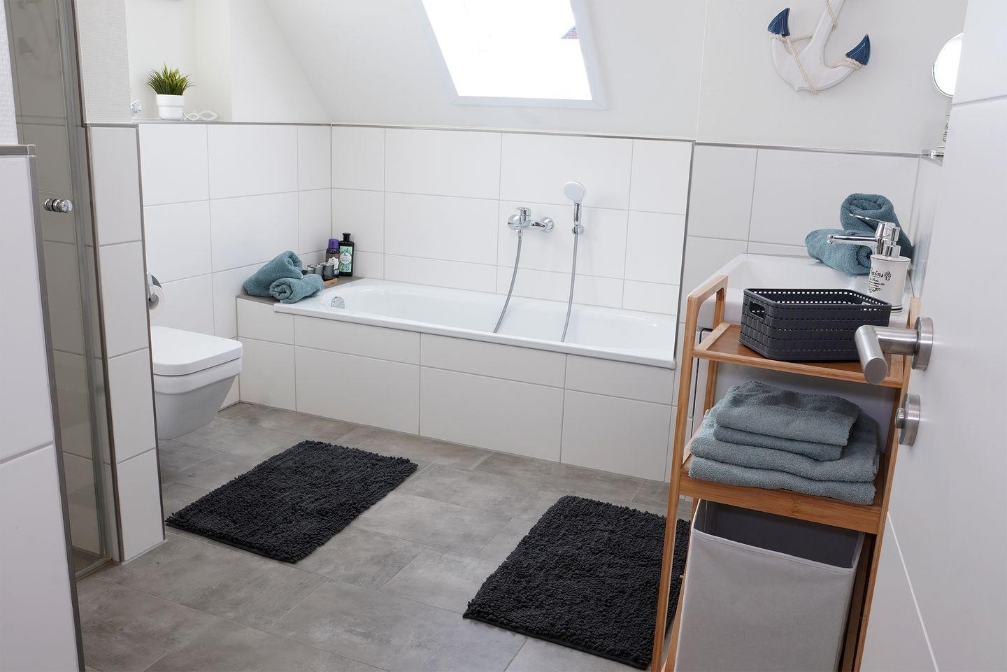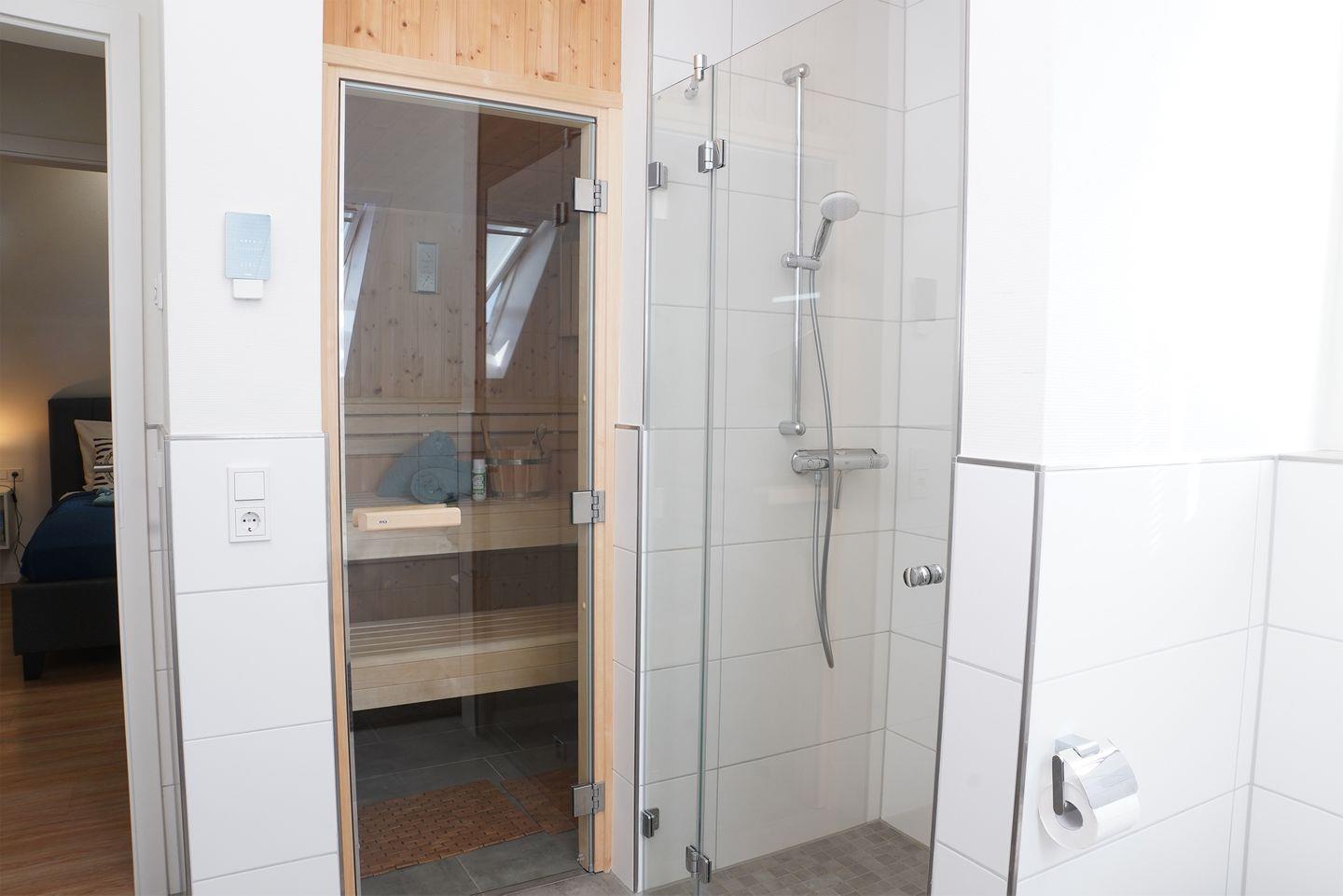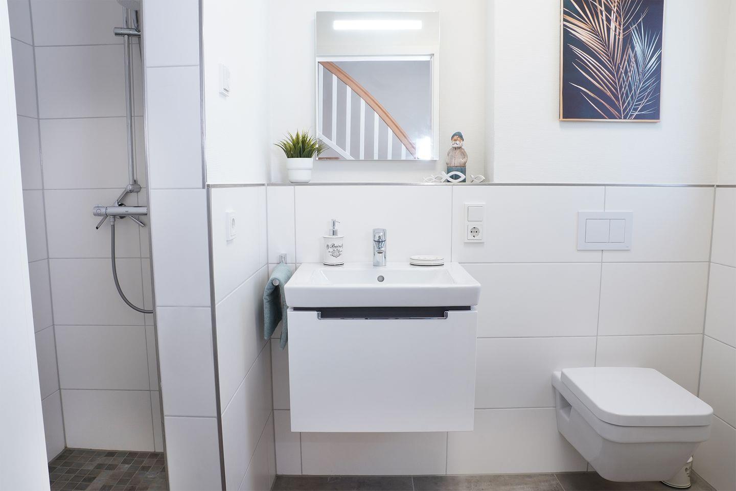 Das große Bad im Obergeschoss bietet dir eine private Sauna, eine Badewanne und eine bodengleiche Dusche. Hier entspannst du nach einem Tag am Deich oder nach einer Wattwanderung. Im Erdgeschoss steht ein weiteres Bad mit bodengleicher Dusche zur Verfügung.
