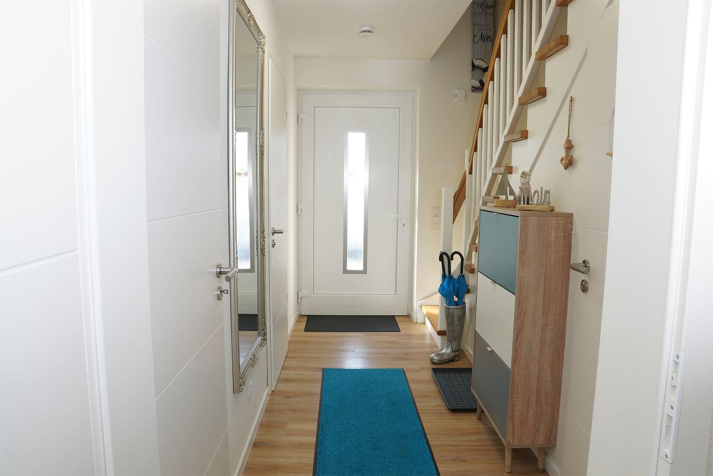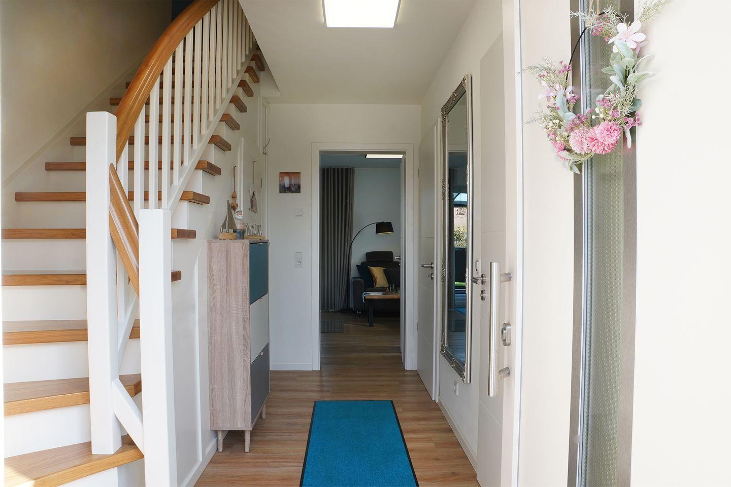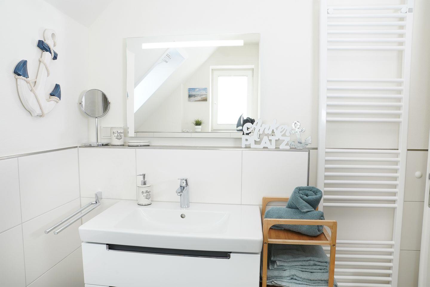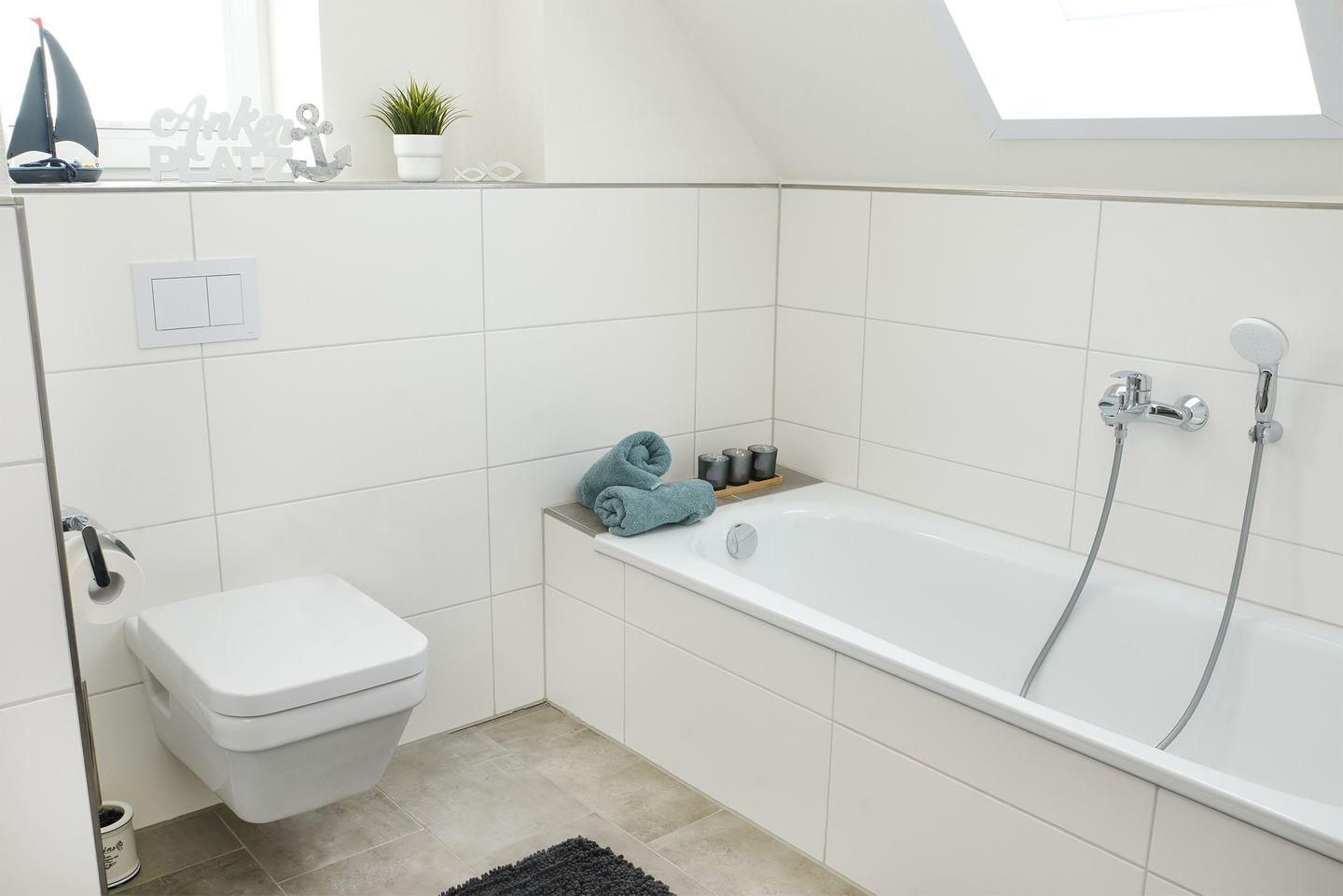 Das große Bad im Obergeschoss bietet dir eine private Sauna, eine Badewanne und eine bodengleiche Dusche. Hier entspannst du nach einem Tag am Deich oder nach einer Wattwanderung. Im Erdgeschoss steht ein weiteres Bad mit bodengleicher Dusche zur Verfügung.