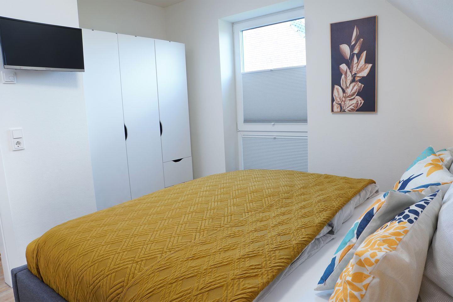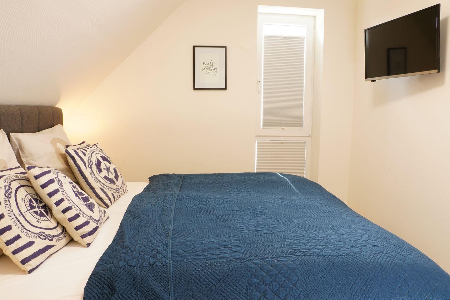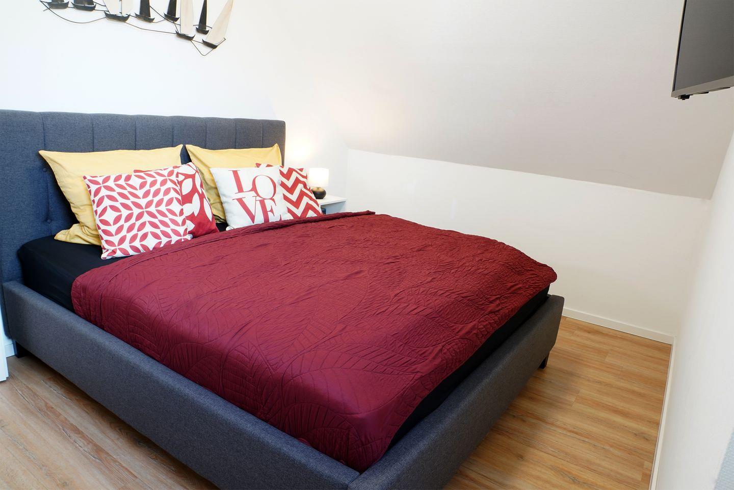 Im Obergeschoss liegen drei Schlafzimmer mit bequemen Boxspringbetten in der Größe 180 x 200 cm. Stauraum für Kleidung ist vorhanden. In jedem Zimmer steht ein Smart-TV bereit.