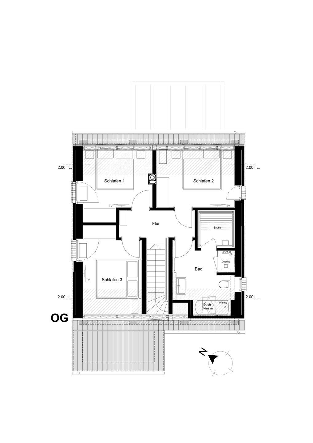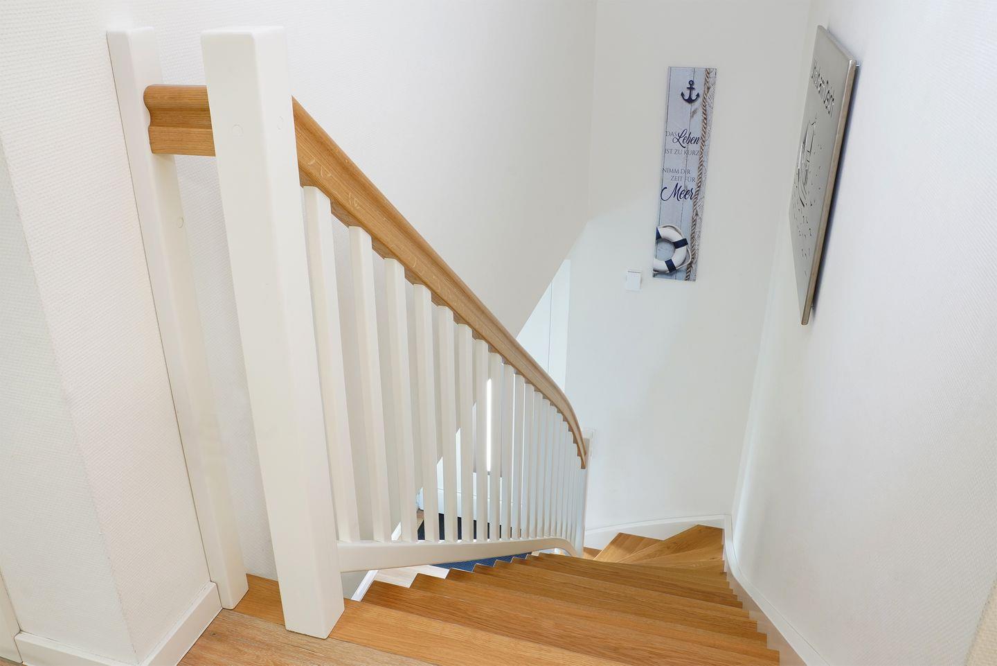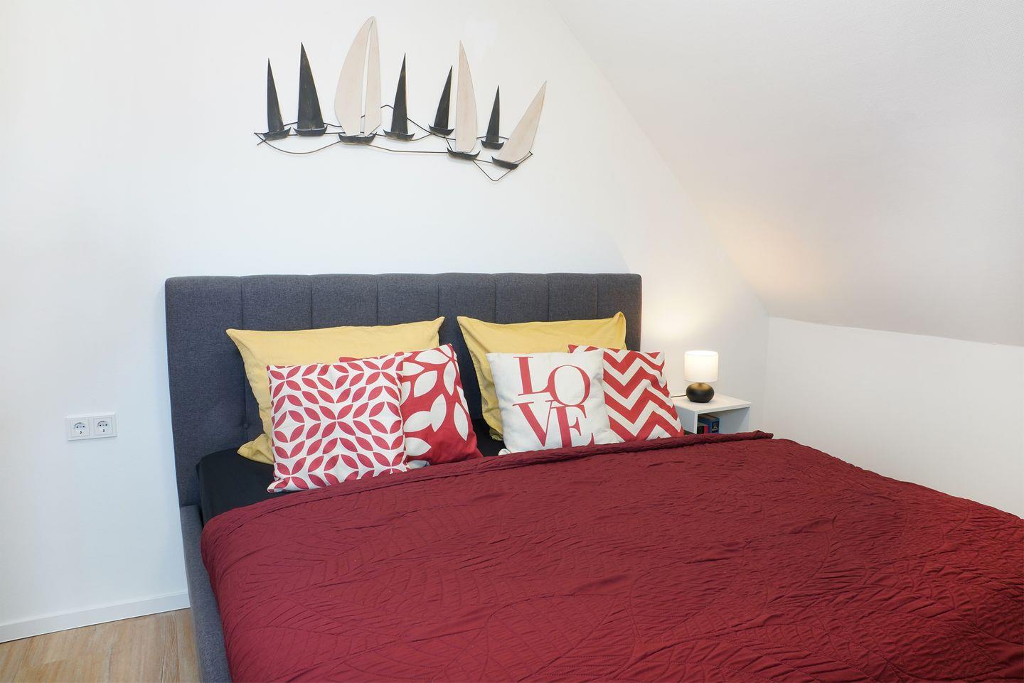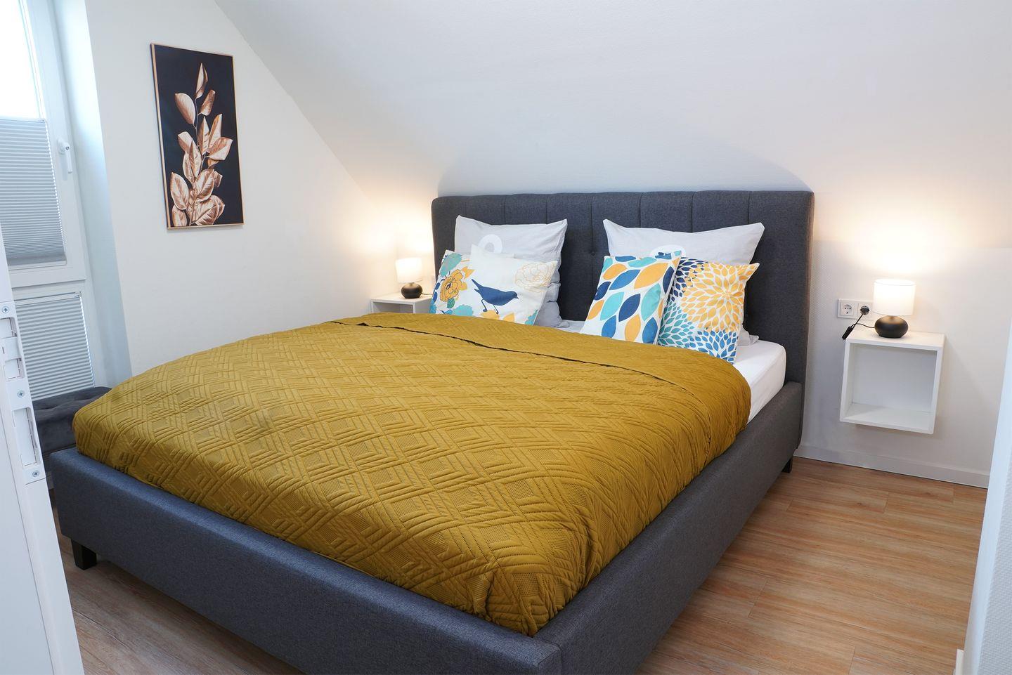 Im Obergeschoss liegen drei Schlafzimmer mit bequemen Boxspringbetten in der Größe 180 x 200 cm. Stauraum für Kleidung ist vorhanden. In jedem Zimmer steht ein Smart-TV bereit.