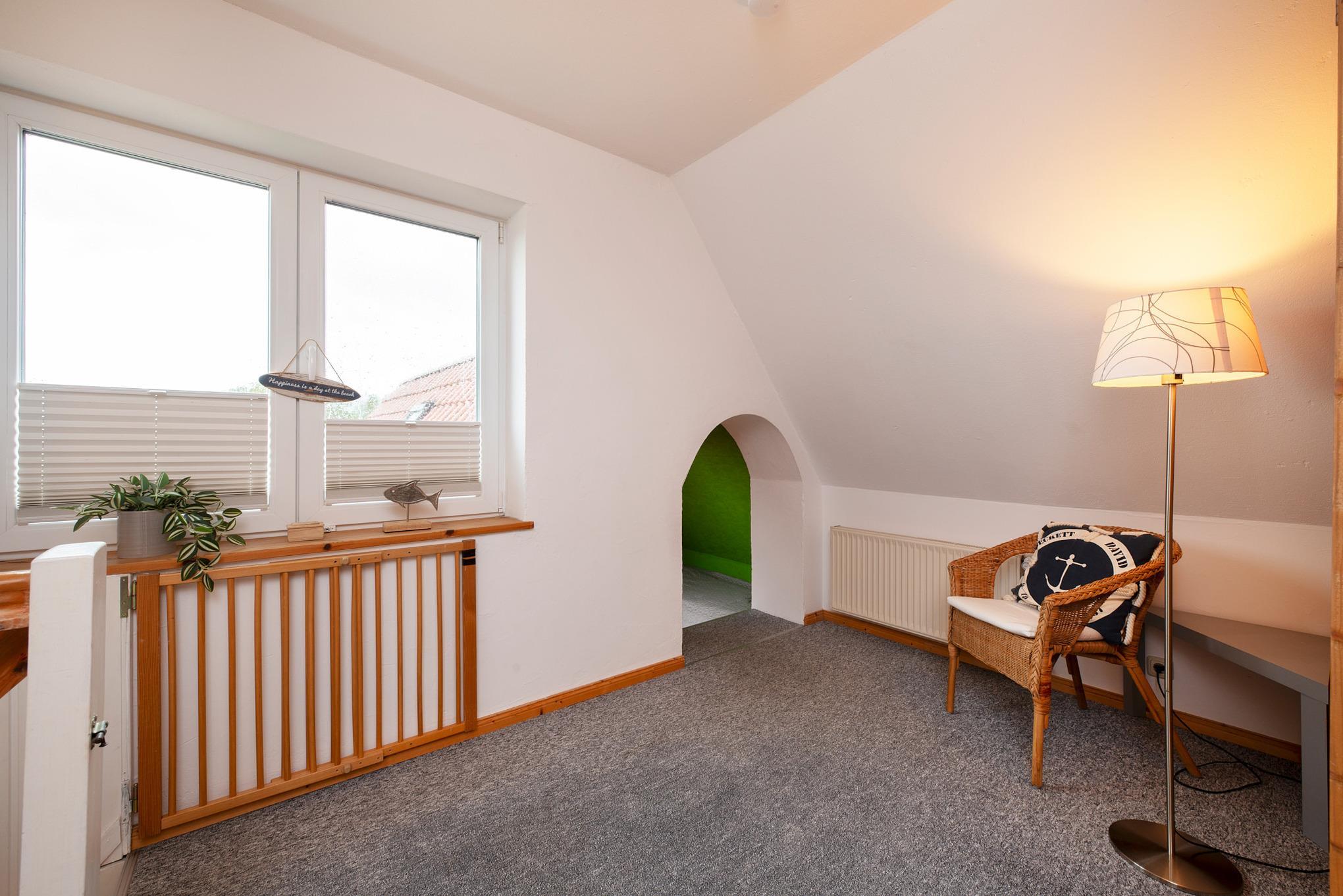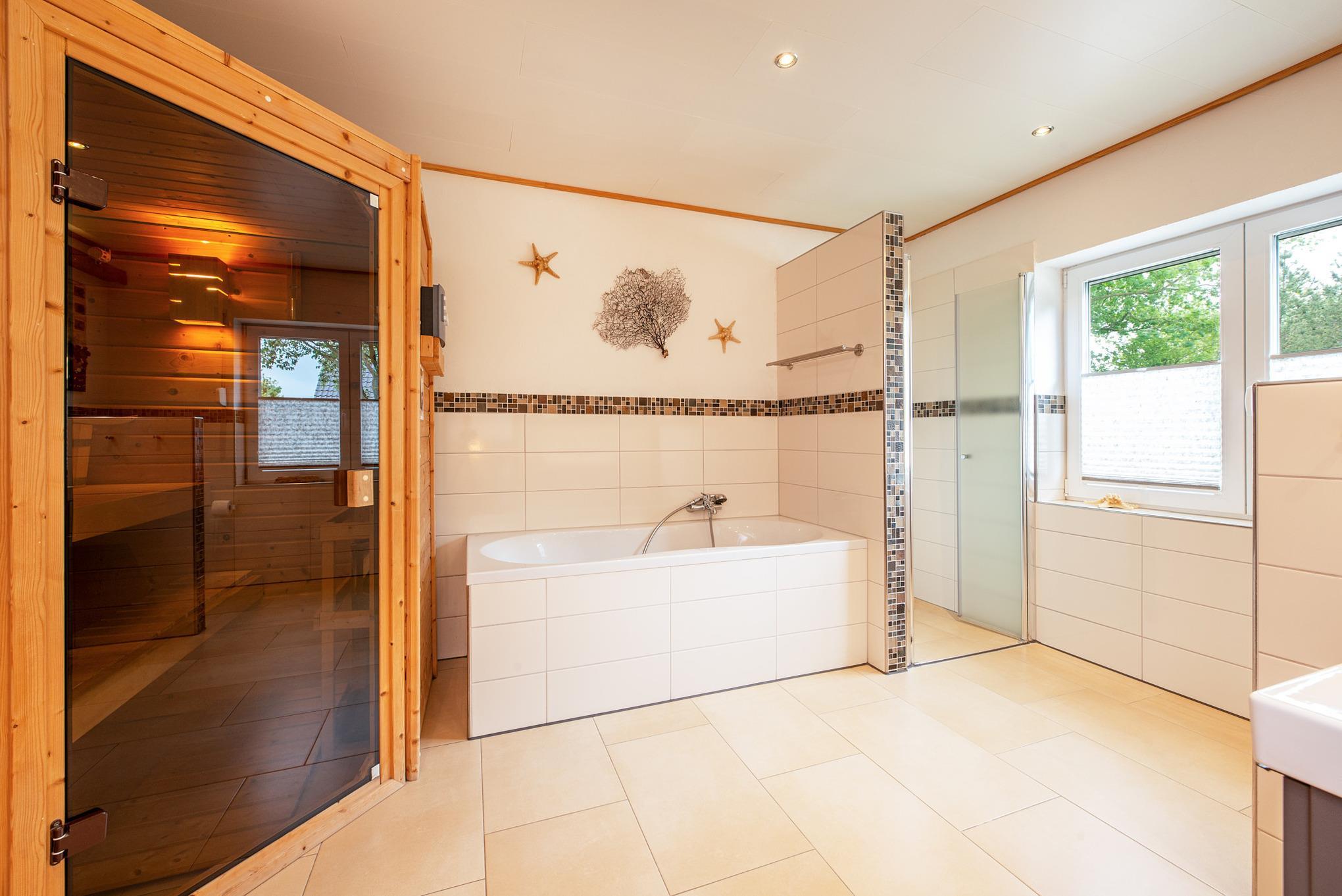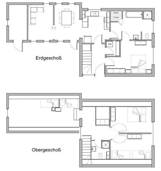 Perfekt für Familien! Der offene Wohnbereich verfügt über einen Kaminofen, ein gemütliches Sofa und einen Satelliten-LED-TV (Blue-Ray-Player, 2.1-Soundsystem plus USB-Anschluss) sowie einen schönen Essbereich mit 8 Stühlen und einer Radio-Kompakt-Anlage (CD, USB, Radio und Bluetooth). Von hier haben Sie Zugang auf die große Terrasse mit Gartenmöbeln, Liegen, eigenem Strandkorb und Grill zum Ausspannen. Die Kinder können im 800 m² großen Garten spielen und toben. Vorhanden sind ein Schaukelgerüst, ein Trampolin und eine Sandkiste. Die gut ausgestattete Küche bietet u.a. mit einer Spülmaschine, einem großen Kühlschrank, einer Mikrowelle und einer Nespresso-Kapselmaschine die Möglichkeit, das Kochen zu genießen. Im Abstellraum befinden sich eine Waschmaschine und weiterer Stauraum. Vom Schlafzimmer mit Doppel-Boxspringbett (180x200 cm) ist ein Extrazugang zum großen Wellness-Badezimmer mit Dusche, Badewanne und Sauna möglich. Die Fußbodenheizung sorgt auch bei schlechtem Wetter für Wohlfühlatmosphäre. Im Obergeschoss sind zwei Schlafzimmer mit einem Doppelbett (160x200 cm) bzw. zwei Einzelbetten (je 90x200 cm). Hier befindet sich auch ein Duschbad, sodass mit 8 Personen kein Gedränge entsteht. Durch einen niedrigen Gewölbeeingang gelangen Kinder in den Spielboden. Hier ist ausreichend Platz zum Spielen und Schlafen. Abends können die Kinder in den zwei gemütlichen Bettnischen (je 90x200 cm) zur Ruhe kommen und von den erlebten Abenteuern träumen. Die Fenster können mit Rollläden verdunkelt werden.