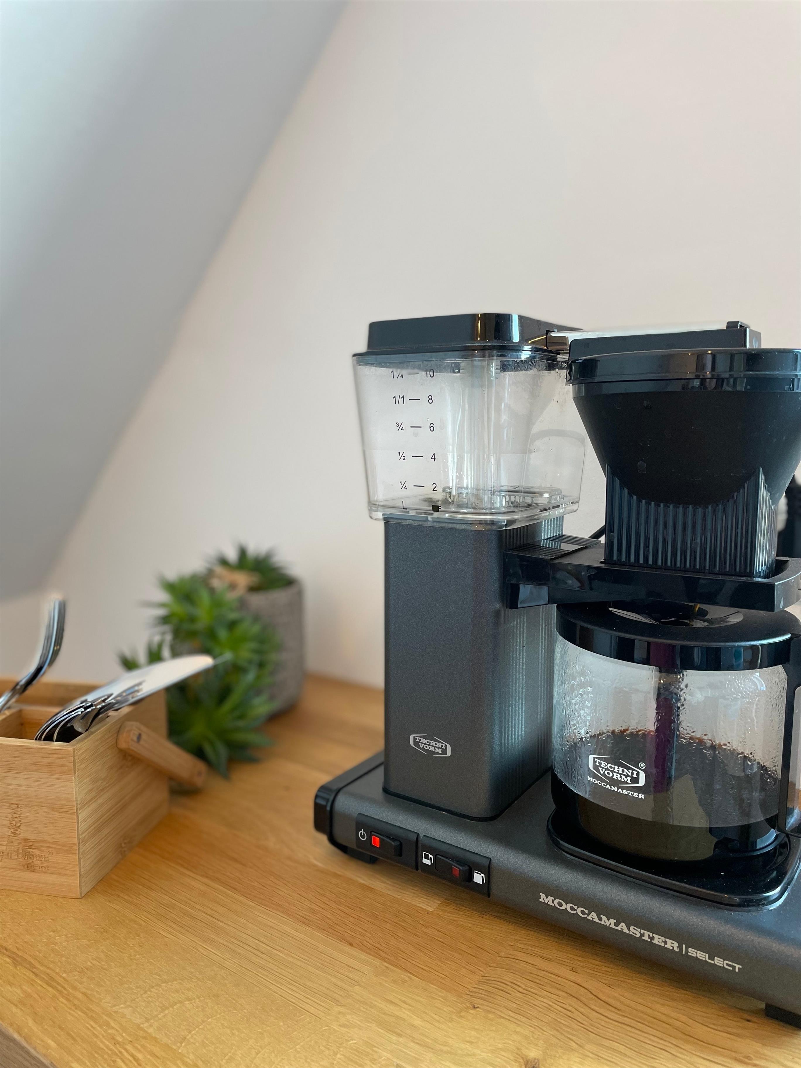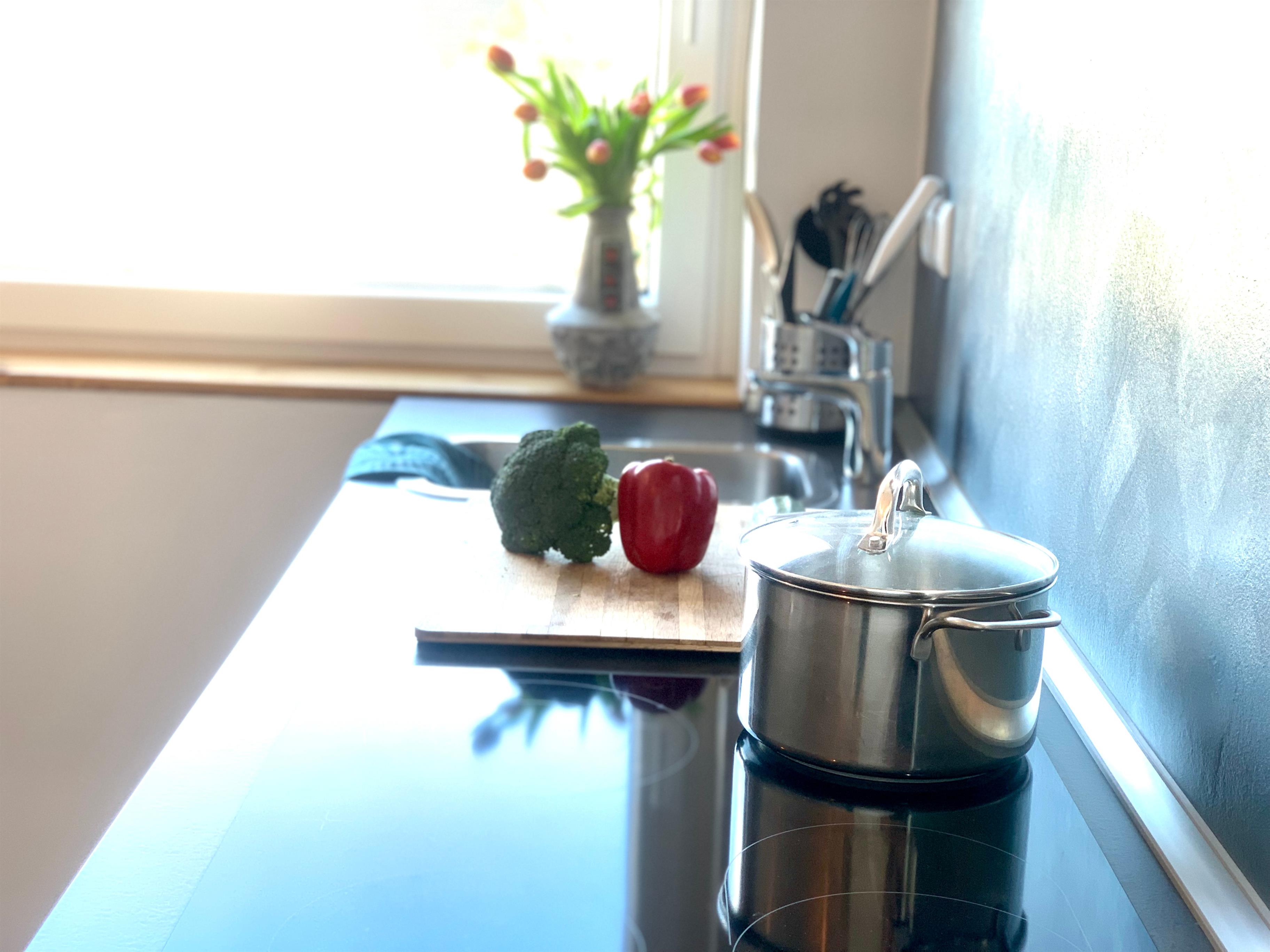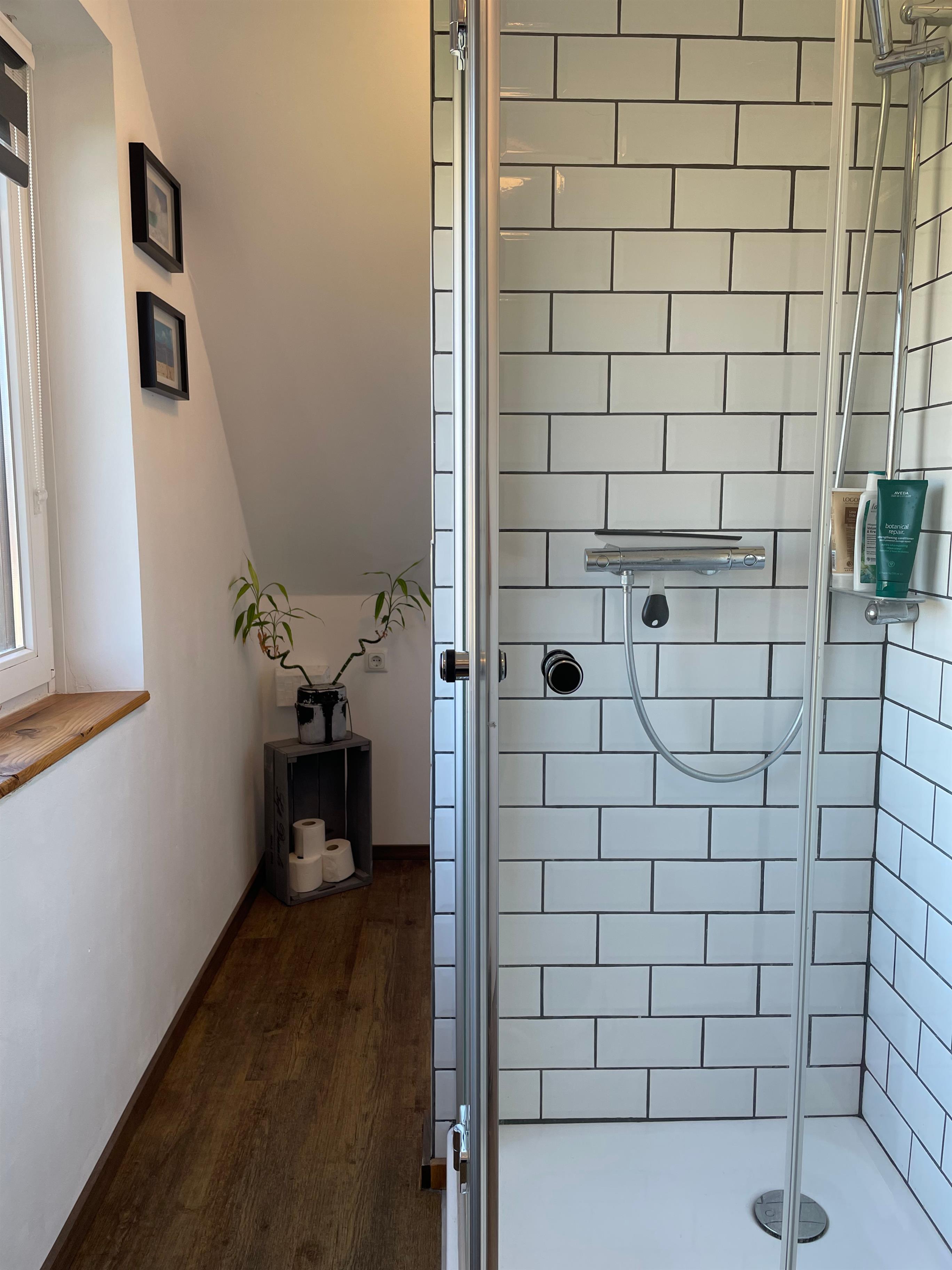 In der hervorragend ausgestatteten Küche findet jeder Hobbykoch die nötigen Utensilien. Highlight der Küche ist der blaue Kühlschrank im Bulli-Stil. Ein helles und modernes Duschbad gehört zu dieser Wohneinheit dazu.