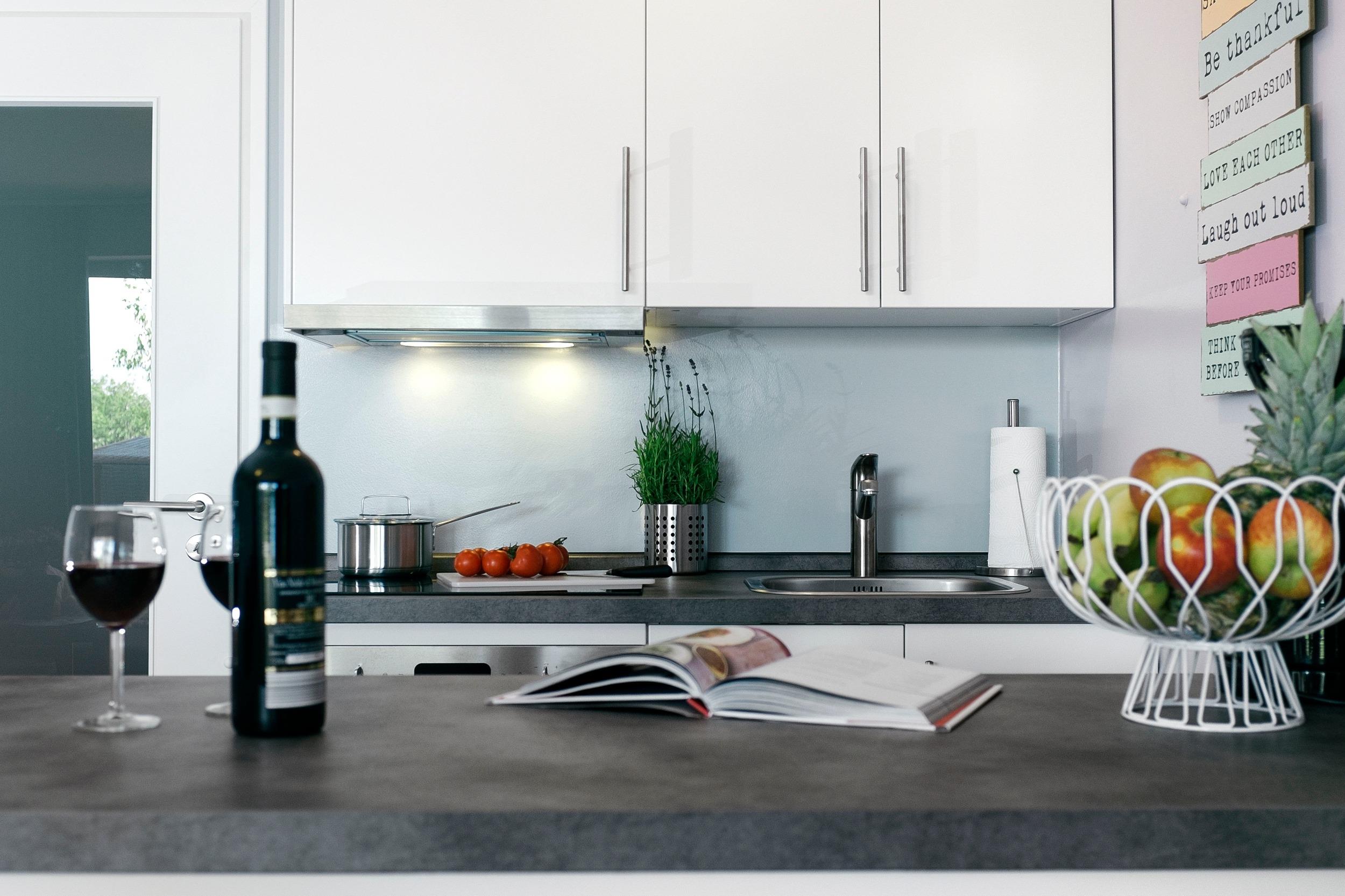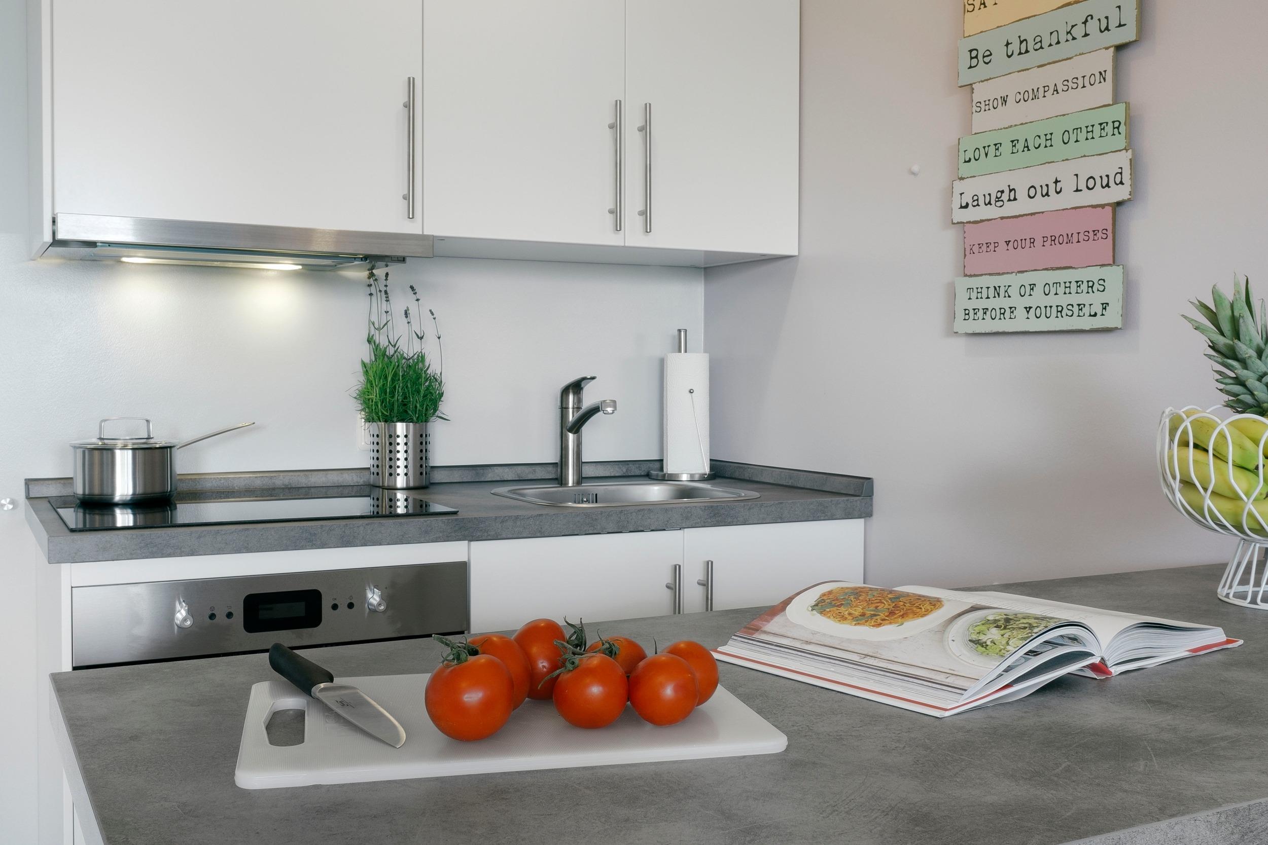 komplett ausgestattete Küche mit umfangreichem Kochutensil