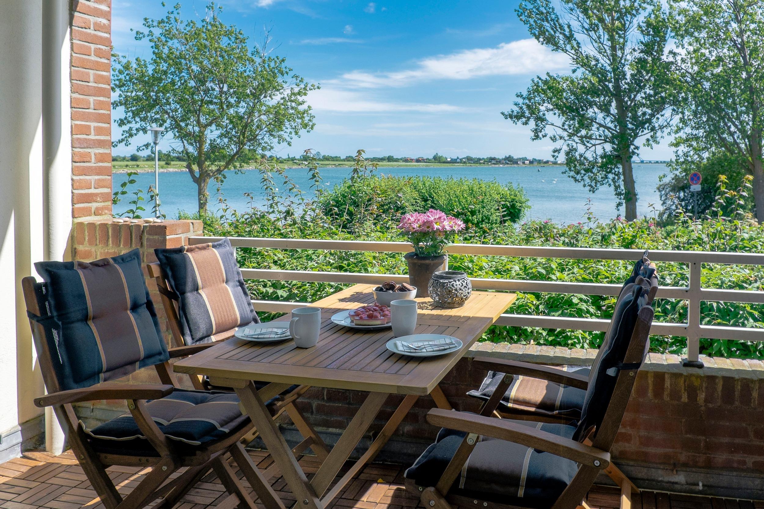 Die windgeschützte Loggia ist geräumig und bietet auch in der kühlen Jahreszeit einen gemütlichen Platz zum "auf das Meer schauen". Vor der in der Ferne sichtbaren Fehmarnsundbrücke tummeln sich Kiter und Surfer. Wer selbst im Wassersport aktiv ist, kann sein Equipment im Surfkeller des Hauses einlagern. Die schräg gegenüber der Wohnung liegende Aalkate bietet Räucherfischspezialitäten und einen gemütlichen Biergarten am Wasser. Die Ferienwohnung liegt im Hochparterre und ist über wenige Stufen zu erreichen. Sie ist allergikerfreundlich und Haustiere sind hier leider nicht erlaubt.