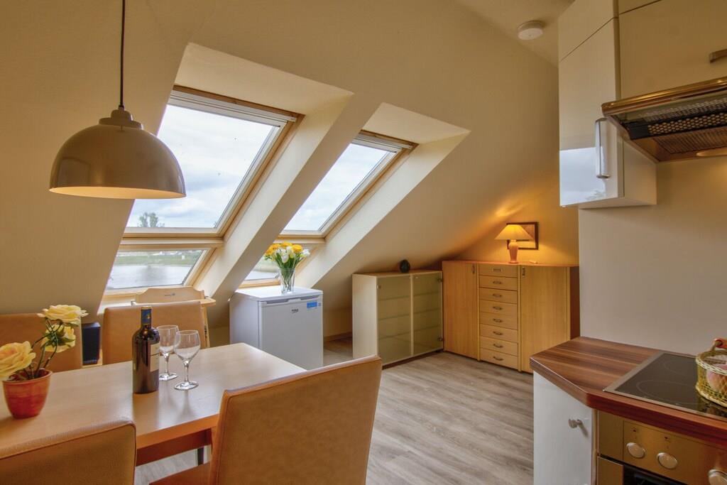 The 50 m² apartment at the swimming pool can accommodate up to 4 people and has a fantastic panoramic sea view of the Burger Binnensee and the Baltic Sea.