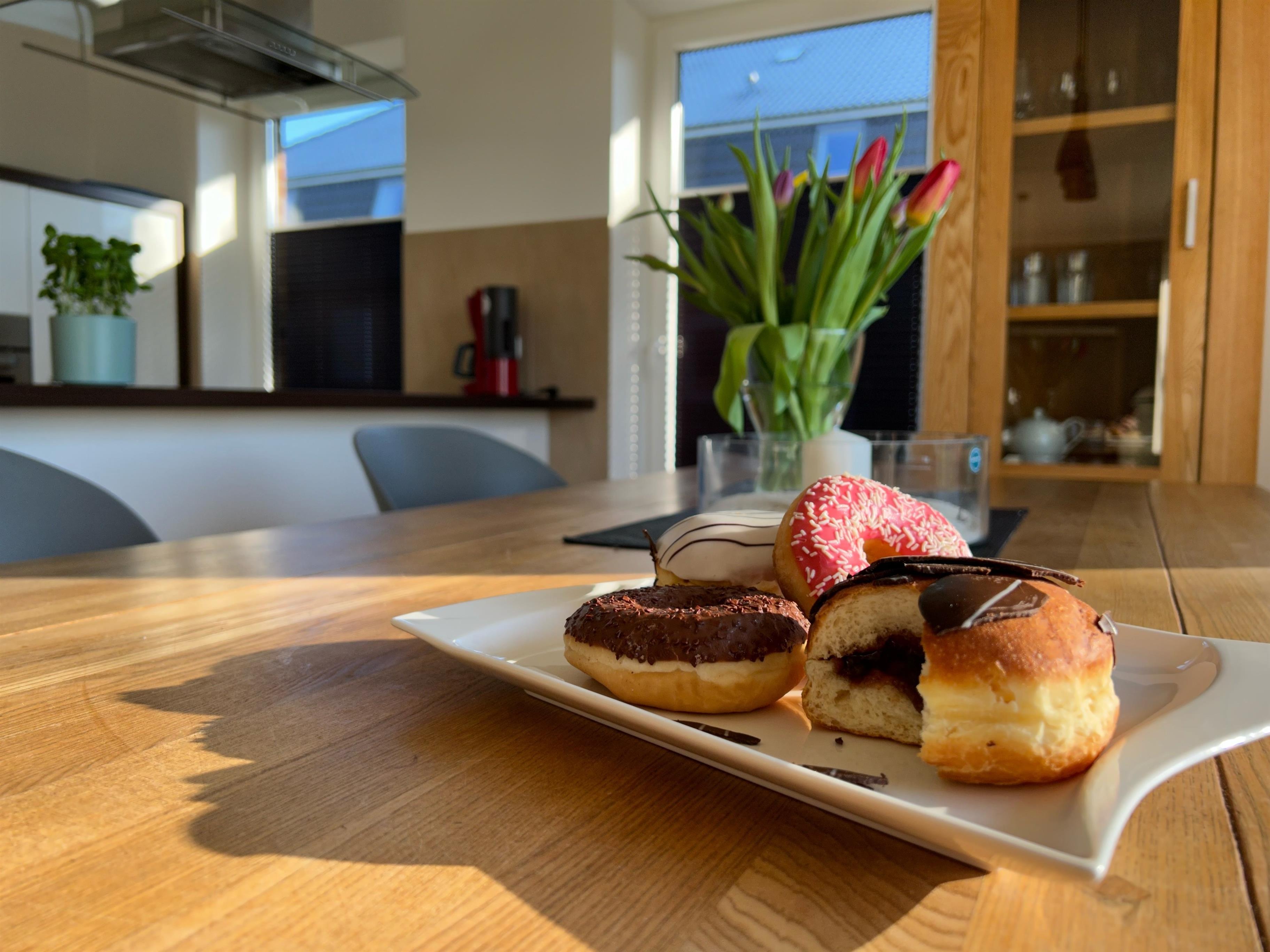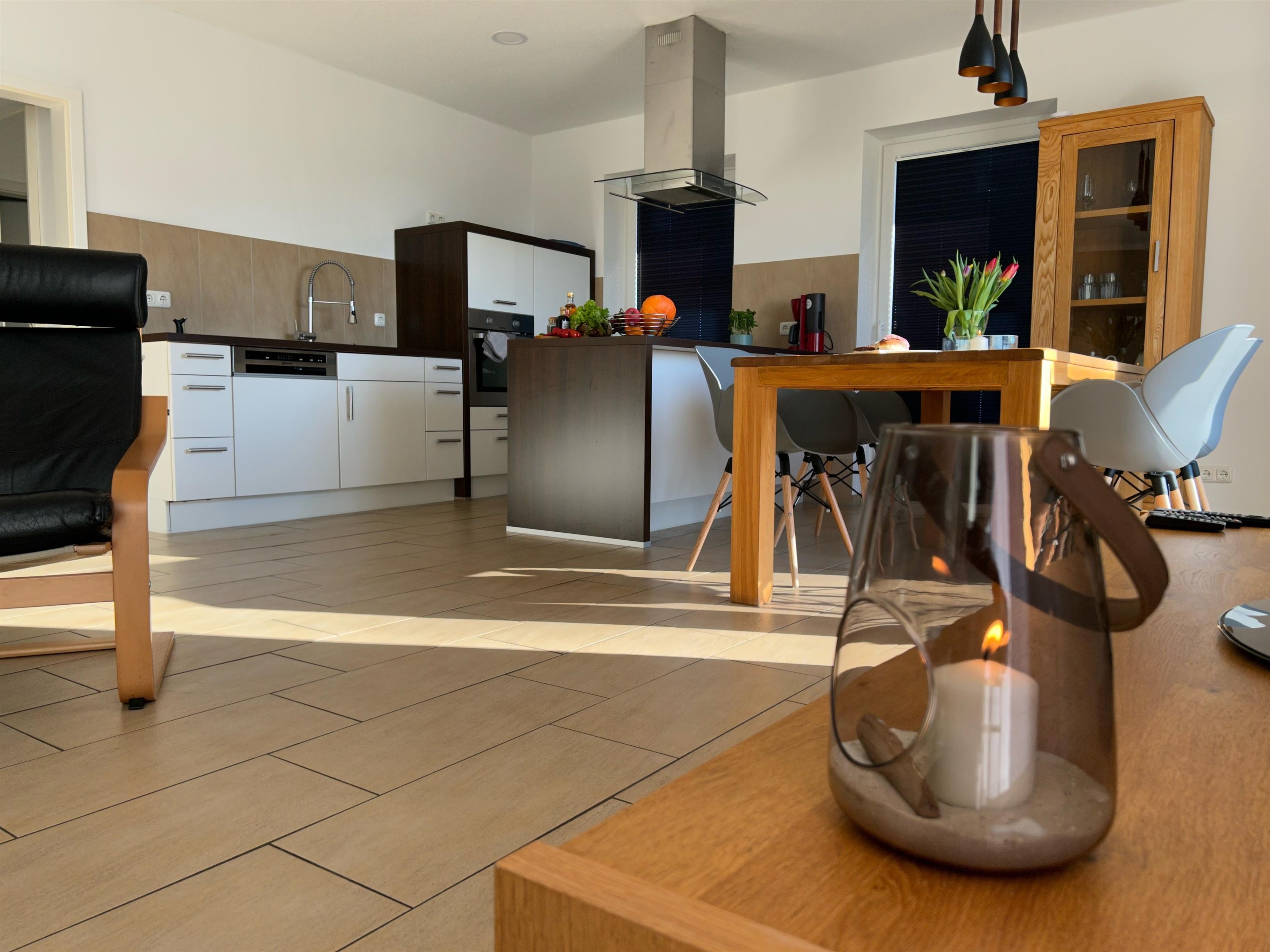 Aus diesem lichtdurchflutetem Raum kann man über vier Terrassentüren auf die Süd-Westterrasse gelangen. Auf dieser stehen ein Strandkorb, ein Tisch mit ausreichend Sitzmöbeln, ein Grill und ein Sonnenschirm.