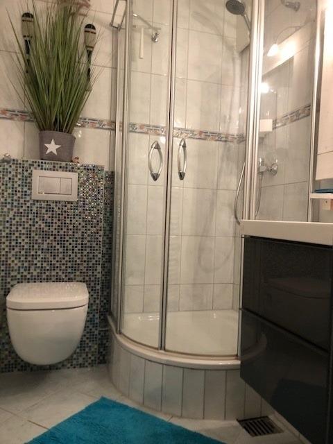 Im Wohlfühl-Duschbad mit edler Glasduschtür und Handtuchheizkörper, WC & Waschbecken mit Unterschrank beginnt ein entspannter Urlaubstag!