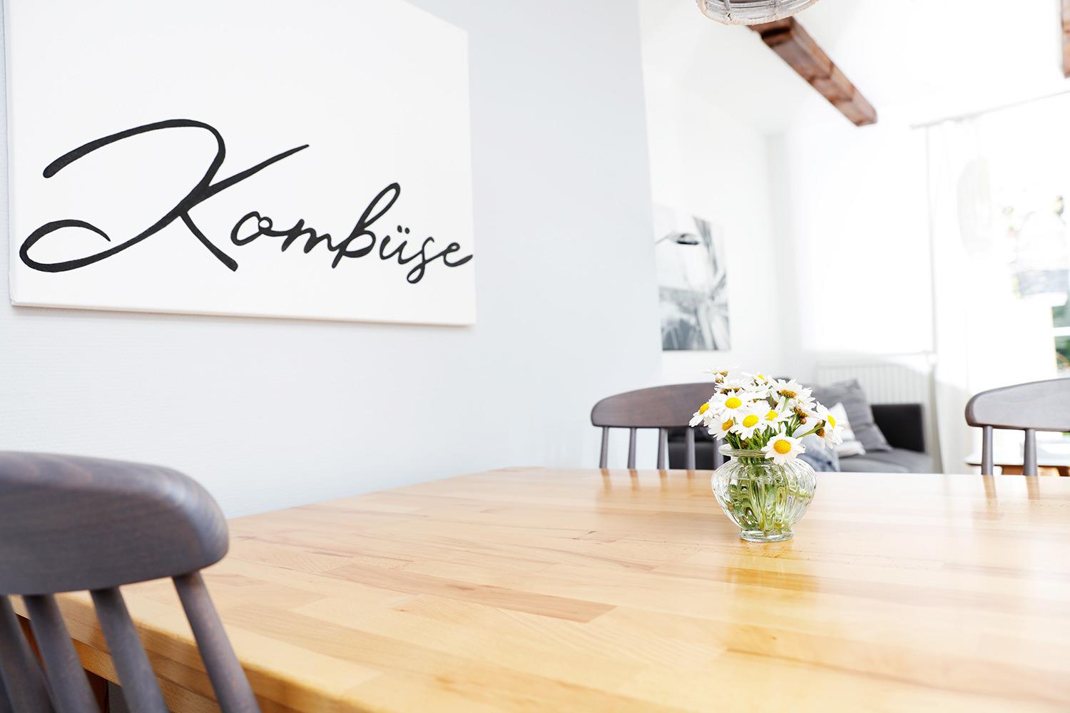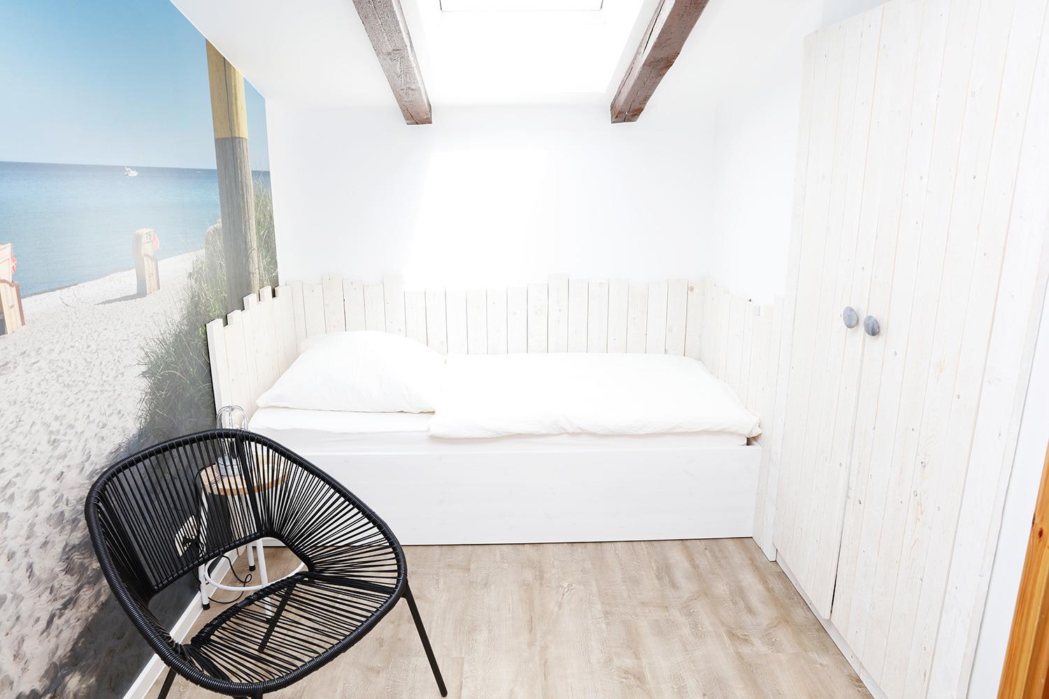 Die Ferienwohnung "ole Backstuv" auf unserem Bauernhof auf Fehmarn ist ca. 70qm groß und bietet damit ordentlich Platz für bis zu 4 Personen plus ein Kleinkind (Babybett). Sie geht über zwei Etagen (Erdgeschoss und 1. Etage). Eure zwei Schlafzimmer sind mit einem Doppelbett und zwei Einzelbetten ausgestattet. Optional stellen wir noch ein Babybett. Eine offene Küche mit gemütlichem Wohnzimmer und Essbereich sowie ein schickes Bad gehören natürlich auch dazu, außerdem habt Ihr eine Südterrasse. Auch auf dem gesamten Hofgelände findet Ihr genügend Lieblingsplätze für Groß und Klein. Bei kühlerem Wetter könnt Ihr Euch in der Infrarotkabine ("Wohlfühlsauna") in unserer Scheune aufwärmen. Auf die Kleinen warten unsere Dinocars und andere Fahrzeuge, ein Spielplatz und Trampolin, eine Spielhalle, Tischkicker, Tischtennis, ein Spielzimmer und ein riesiger Garten zum Austoben. Außerdem freuen sich unsere Ziegen und Kaninchen auf einen Snack oder eine Streicheleinheit. Also: Auf gehts, einfach mal stranden!
