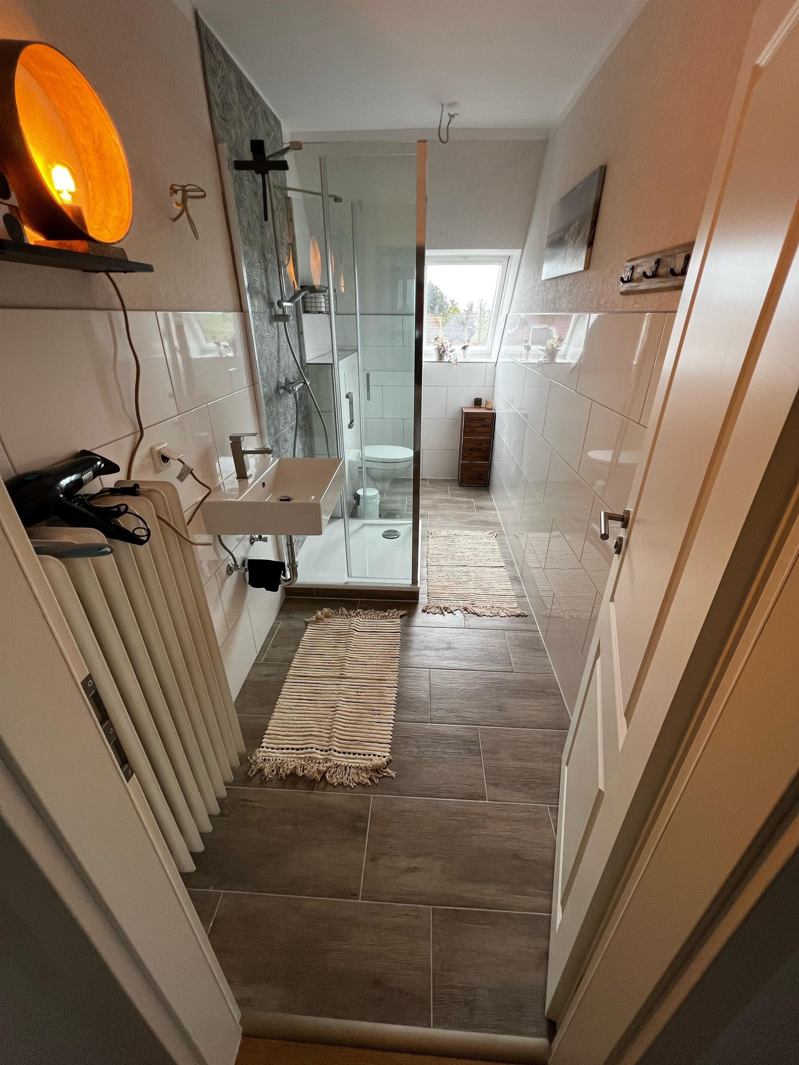 Das Badezimmer ist mit einer Dusche ausgestattet.