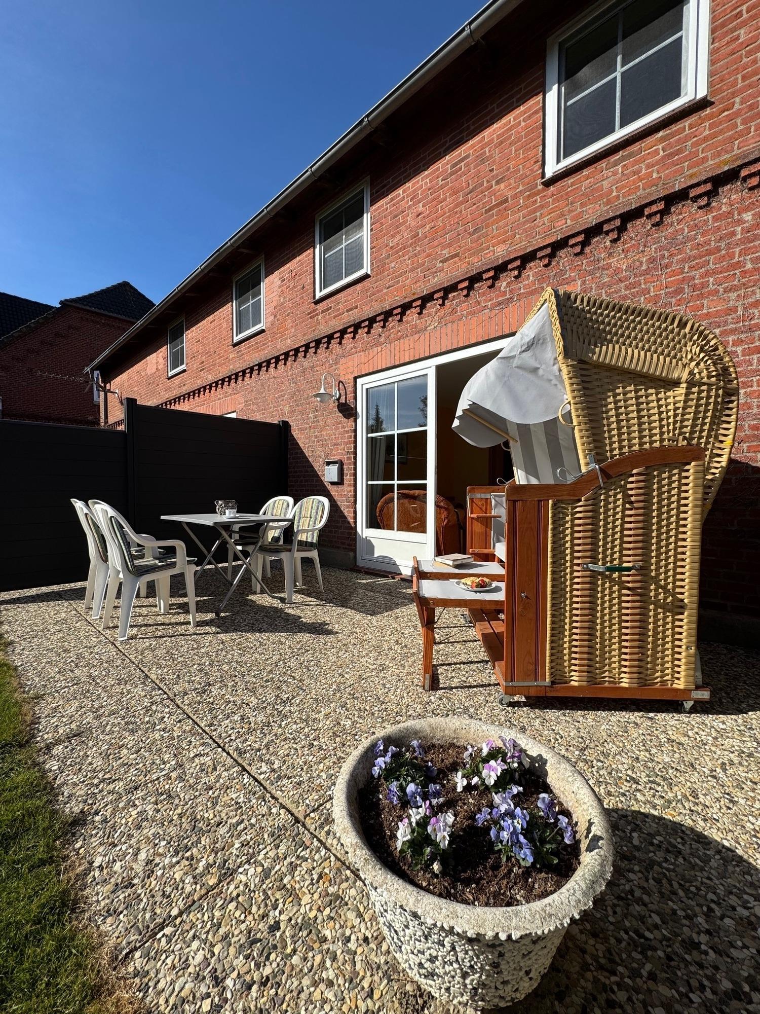Draußen wird es richtig schön: Deine private Südterrasse mit Gartenmöbeln und Strandkorb lädt zum Sonne tanken, Frühstücken oder entspannten Lesen ein.