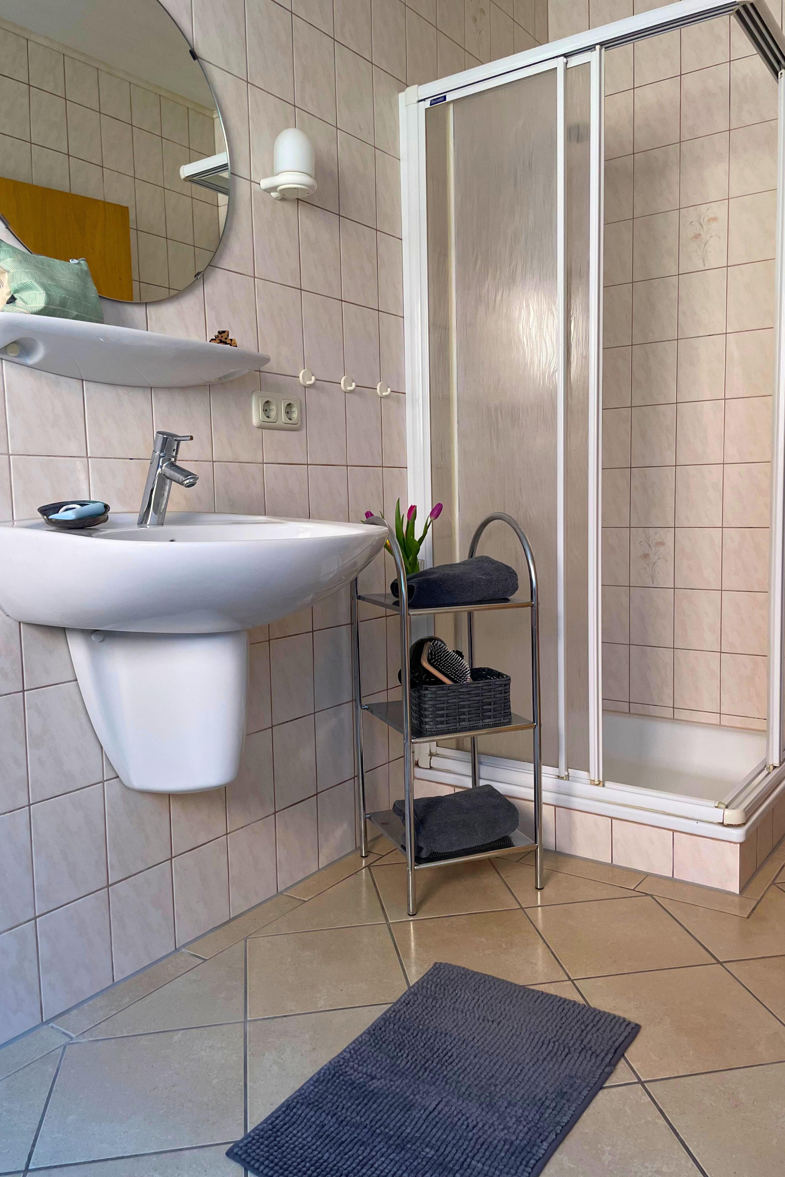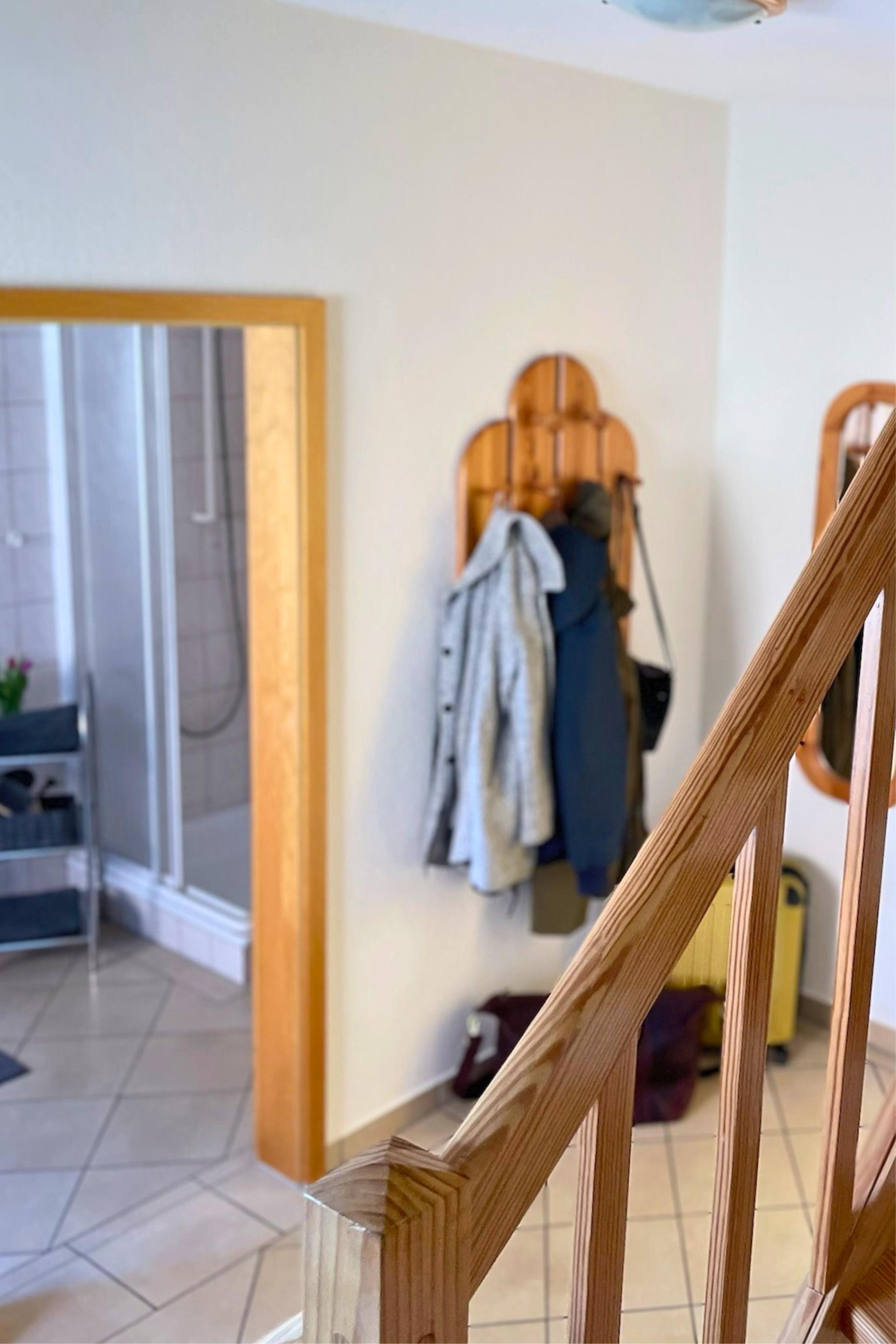Im Erdgeschoss erwartet dich ein heller Wohnbereich mit gut ausgestatteter Küchenzeile, gemütlicher Sitzecke und Duschbad.
