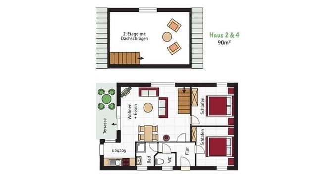 Unsere Ferienhäuser bieten mit 89 qm viel Platz für einen erholsamen Urlaub mit der Familie. Entspannen Sie im gemütlich eingerichteten Wohnzimmer mit Essbereich vor dem Kamin oder auf der eigenen überdachten Terrasse mit Gartenmöbeln und Grill. In der Lese- und Spiele-Ecke werden sich die Kinder besonders wohlfühlen