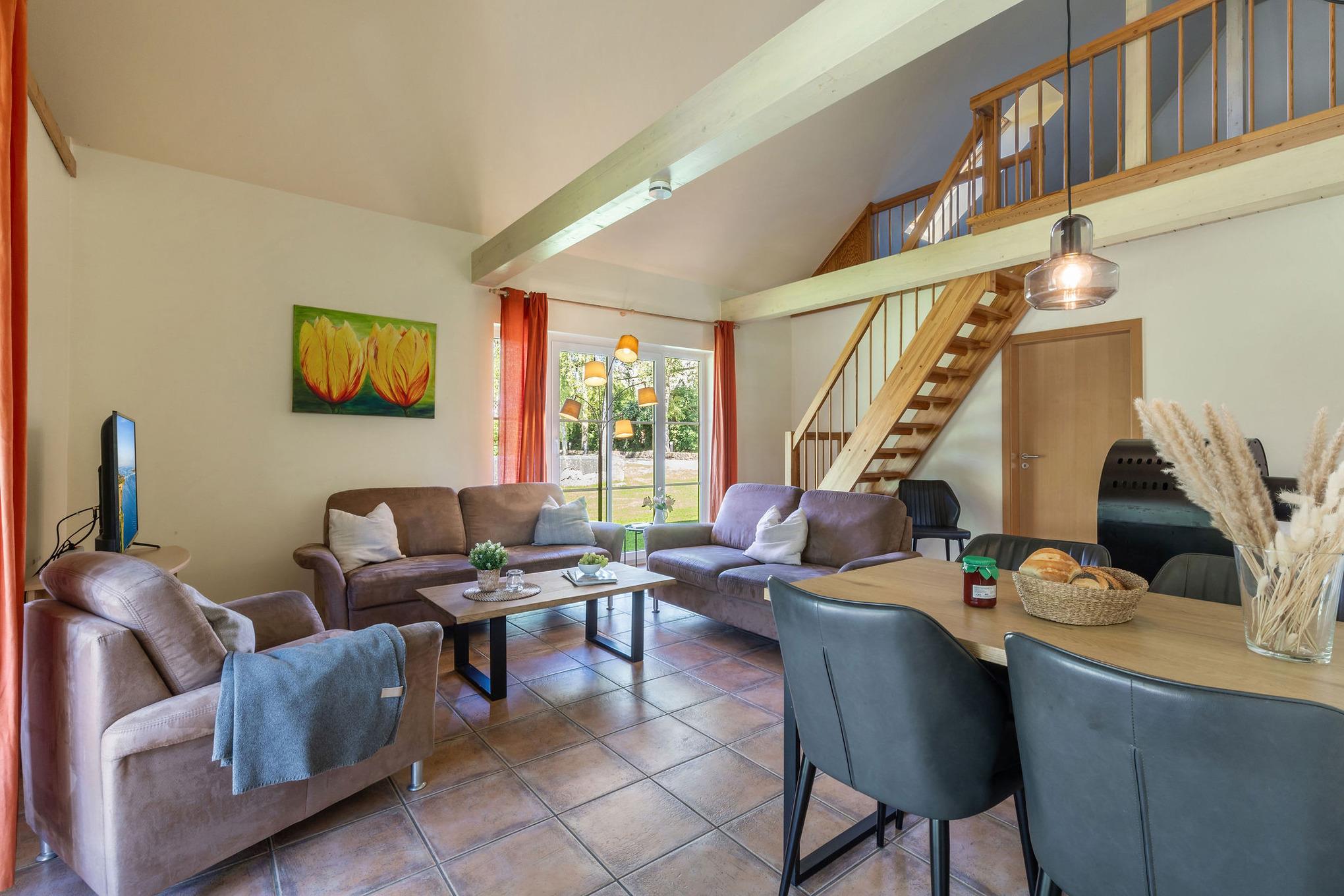 Unsere Ferienhäuser bieten mit 89 qm viel Platz für einen erholsamen Urlaub mit der Familie. Entspannen Sie im gemütlich eingerichteten Wohnzimmer mit Essbereich vor dem Kamin oder auf der eigenen überdachten Terrasse mit Gartenmöbeln und Grill. In der Lese- und Spiele-Ecke werden sich die Kinder besonders wohlfühlen