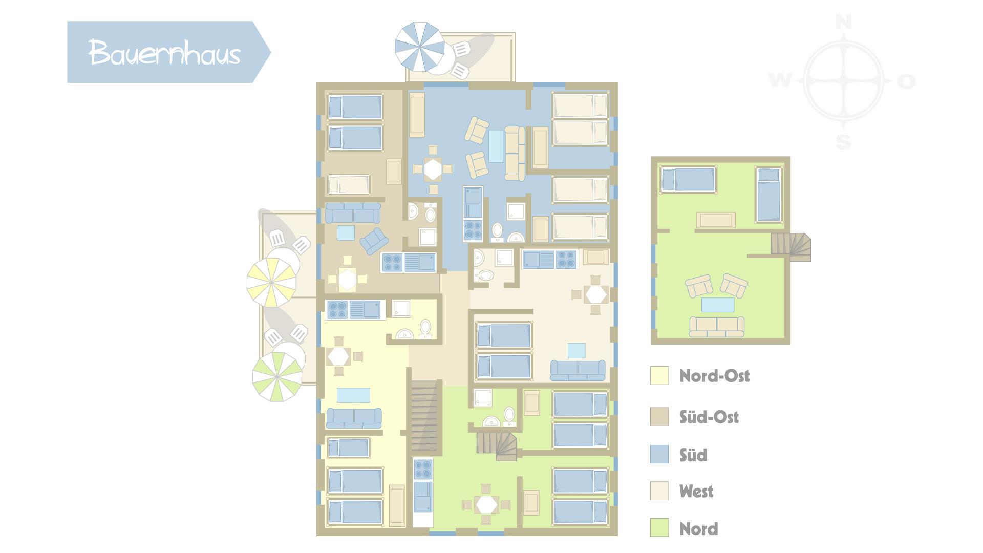 Wohnung "Süd Ost" (40qm): Die Wohnung befindet sich im ersten Stock des Bauernhauses. Sie hat ein separates Schlafzimmer, Duschbad mit WC, einen Wohnraum mit voll ausgestatteter Küche, Esstisch, Sofagarnitur (Schlafsofa), Doppelbett, Flachbild-TV, DVD-Player usw. und einen Südbalkon mit Blick auf den Spielplatz, die Ponyweide und die Ostsee. Die modern renovierte Wohnung ist vom DTV mit vier Sternen ausgezeichnet.