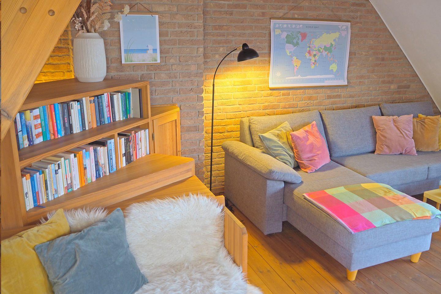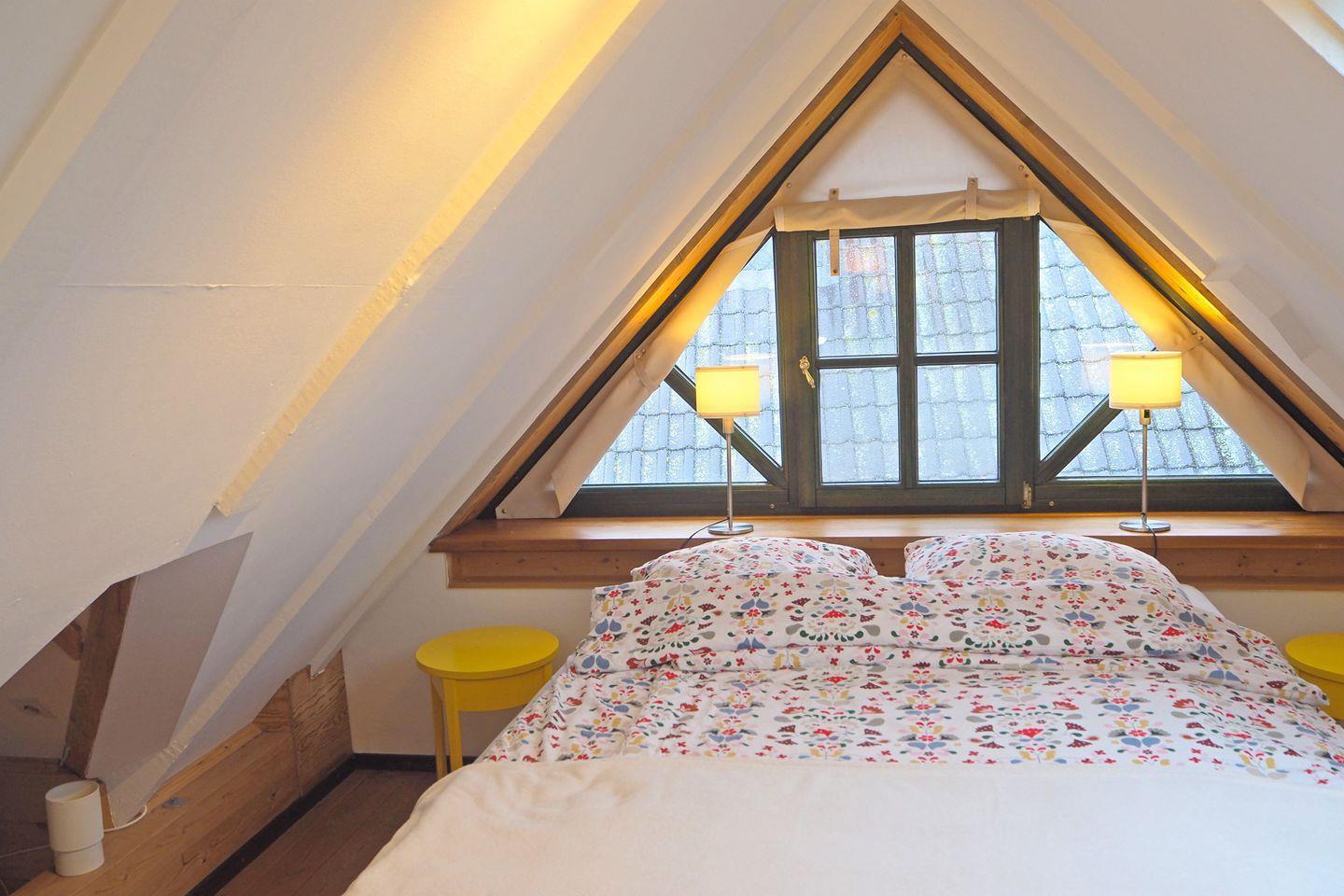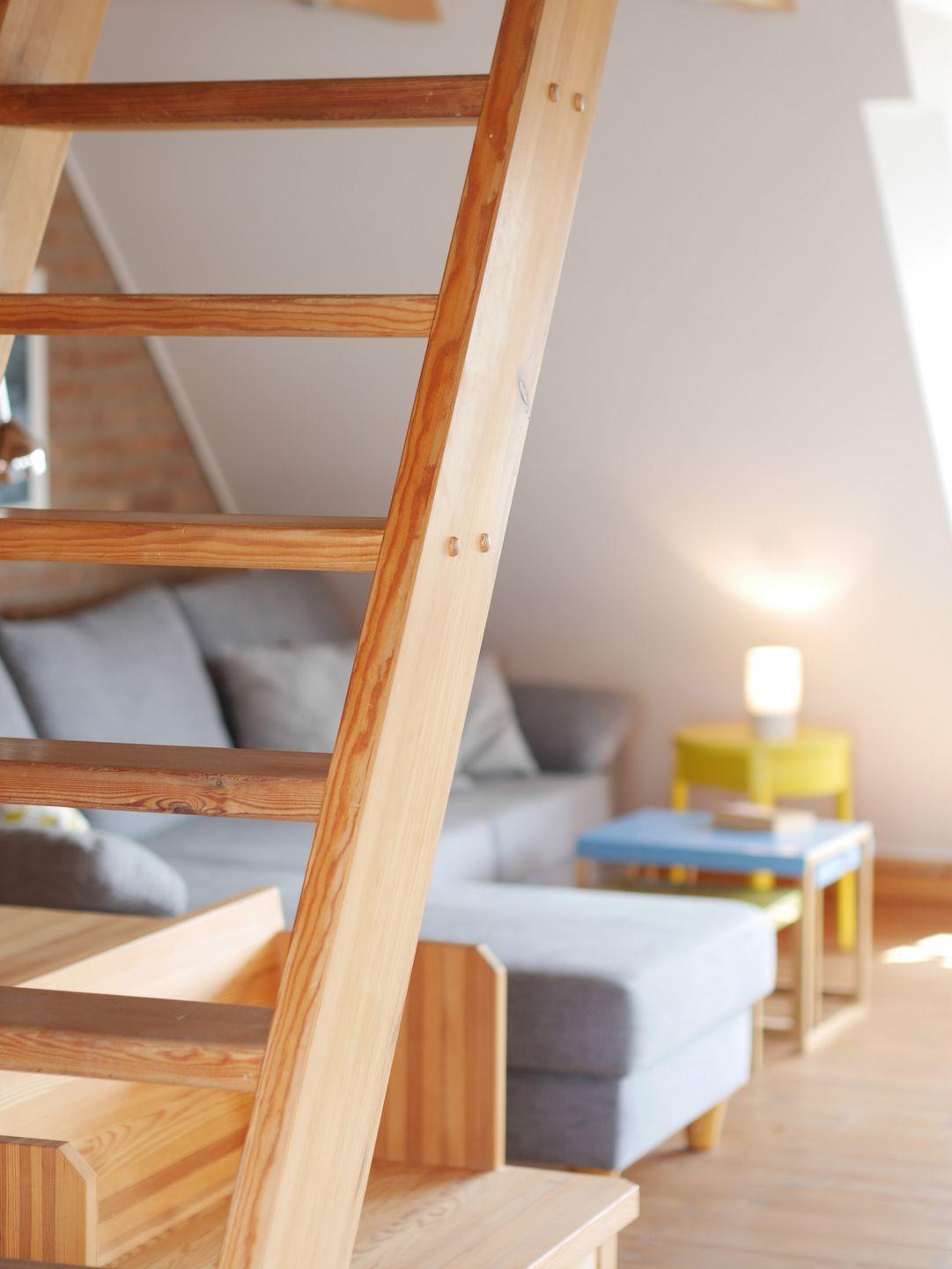Im ersten Obergeschoss lädt ein großzügiges Wohnzimmer mit Schlafsofa, was eine weitere Schlafmöglichkeit für zwei Personen bietet, zum Verweilen ein. Über eine steilere Treppe gelangen Sie ins gemütliche Dachgeschoss, wo sich das Schlafzimmer unter charmanten Dachschrägen befindet. Links vom Doppelbett ist eine liebevoll gestaltete Schlafkoje untergebracht – ein kleines Abenteuerreich, das sich ideal für Kinder eignet. Bitte beachten Sie, dass das Dachgeschoss offen gestaltet ist und keine Tür zum darunterliegenden Wohnbereich vorhanden ist.