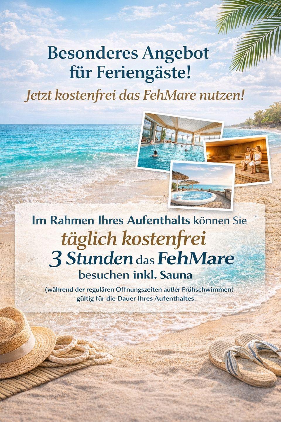 Bei Buchung dieser Unterkunft ist die kostenlose Nutzung des Schwimmbades Fehmare inklusive Saunabereich bis zu 3 Stunden täglich Ihres Aufenthaltes enthalten.