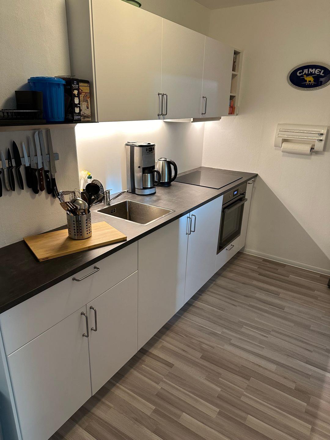 Neue Einbauküche mit moderner Ausstattung (Kühlschrank, Kaffeemaschine, Wasserkocher, Toaster, Mixer)