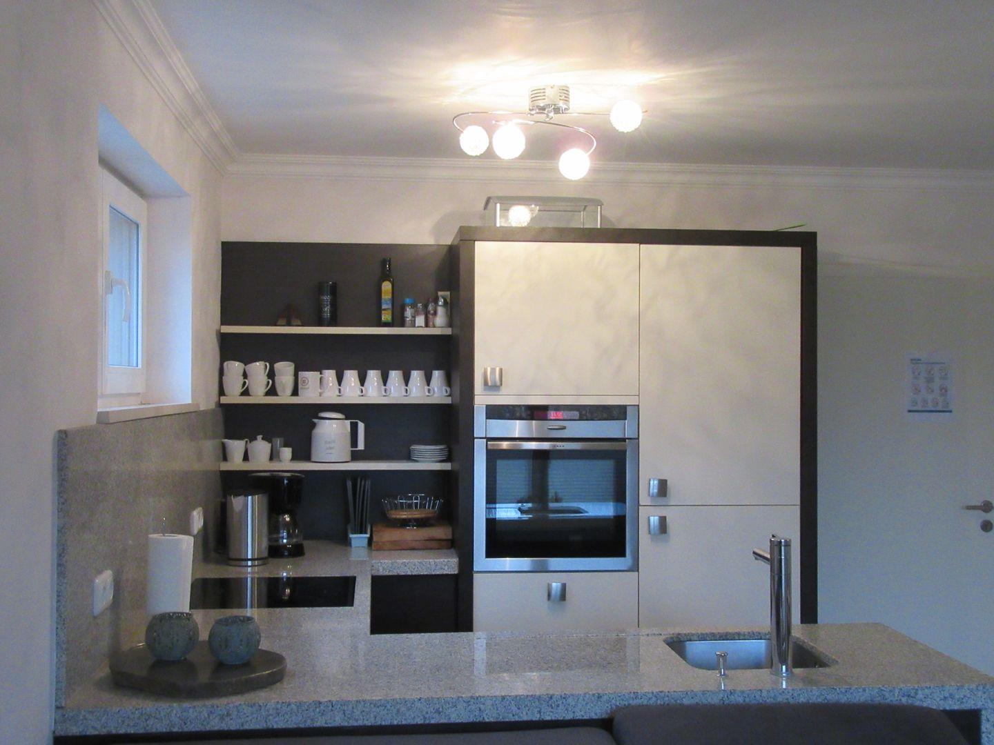 Voll ausgestattete Einbauküche, inklusive Mikrowelle und Backofen auf Augenhöhe