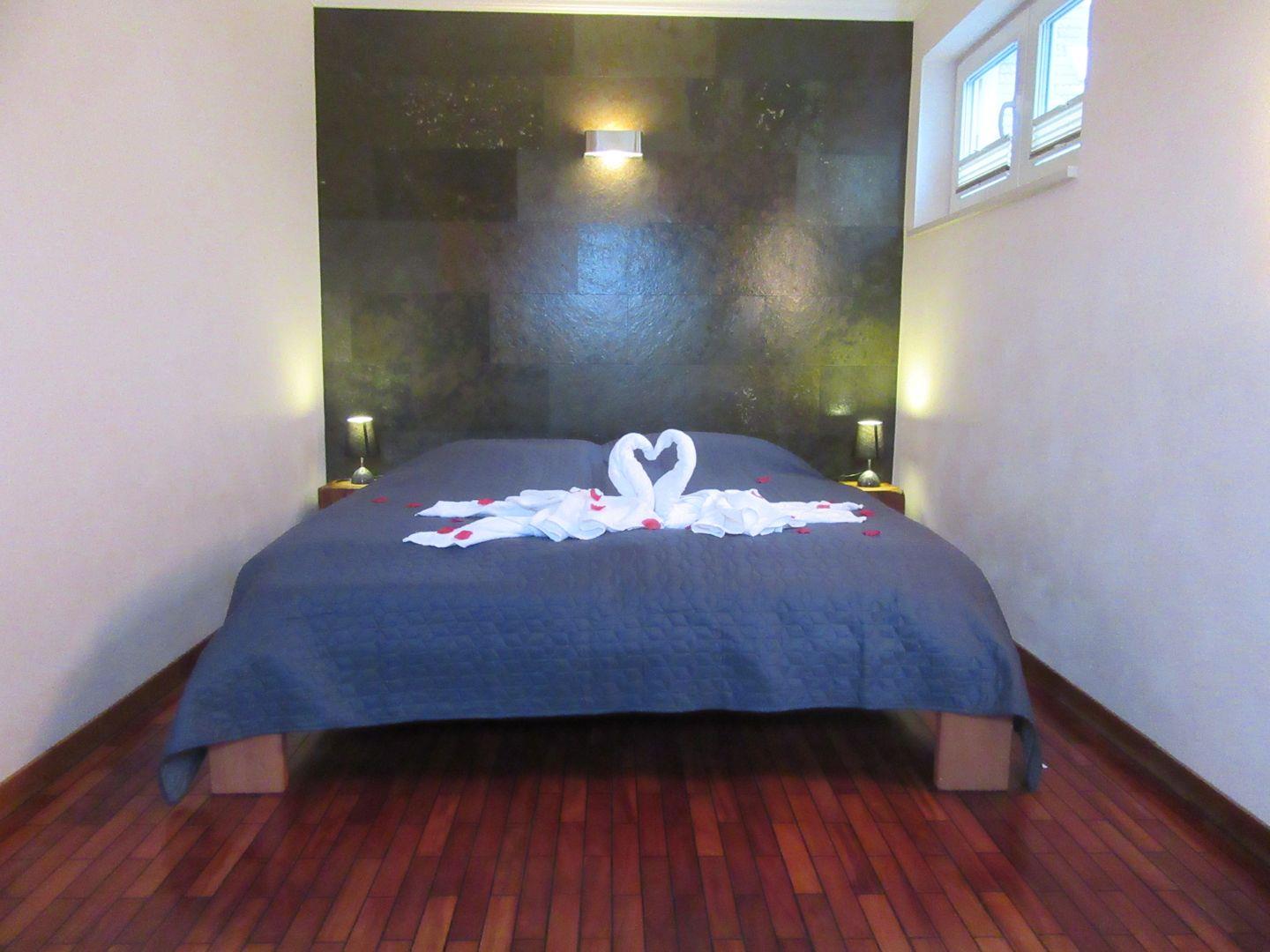 1 Schlafzimmer mit Doppelbett und TV