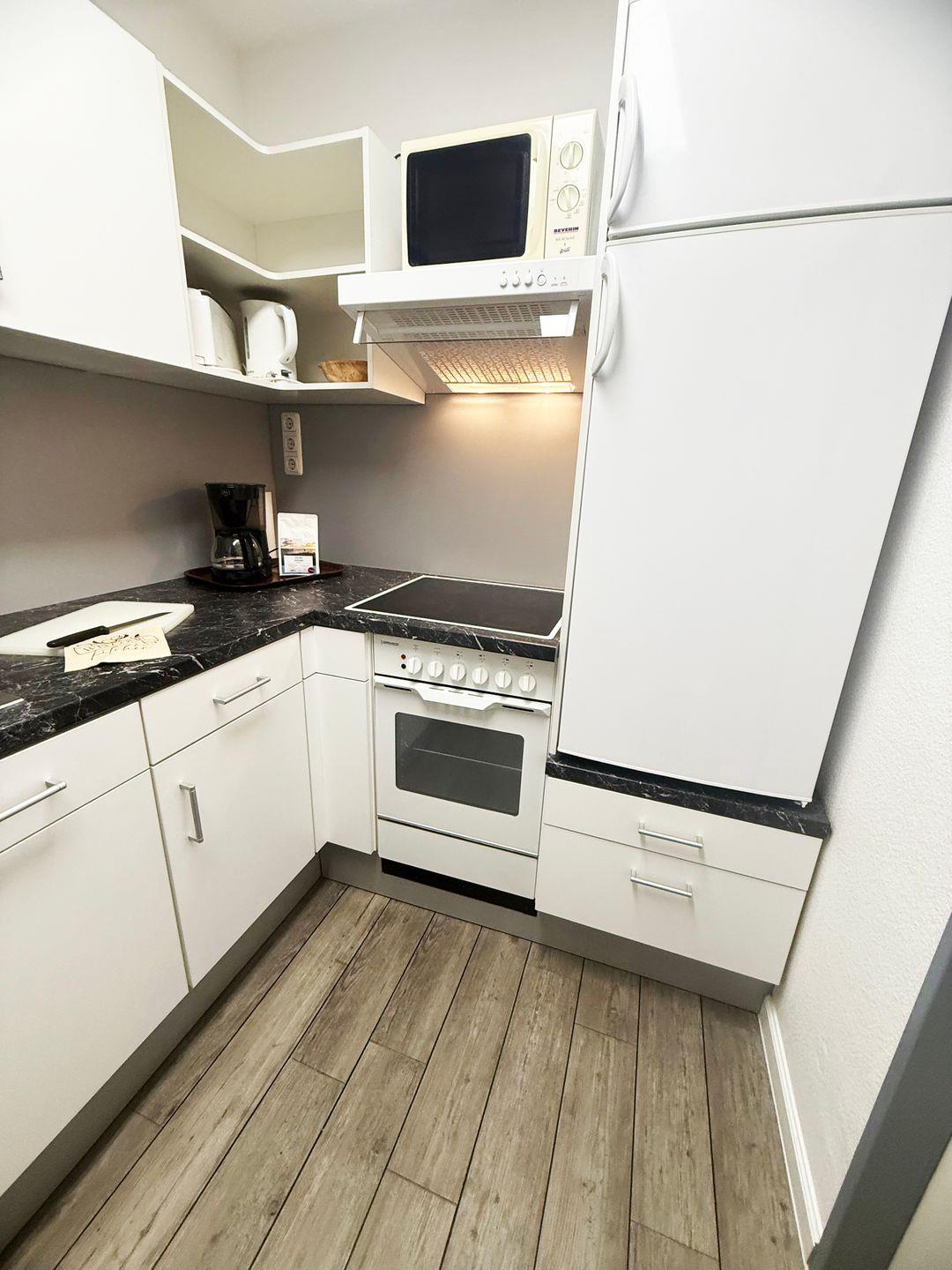 Toaster, Besteck, Mikrowelle, Ceranfeld, Küchenzeile, Gefrierfach, Geschirr, Kühlschrank, Spülmaschine, Kochtöpfe, Filterkaffeemaschine, Backofen, Wasserkocher