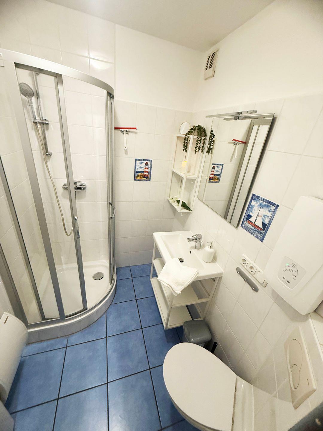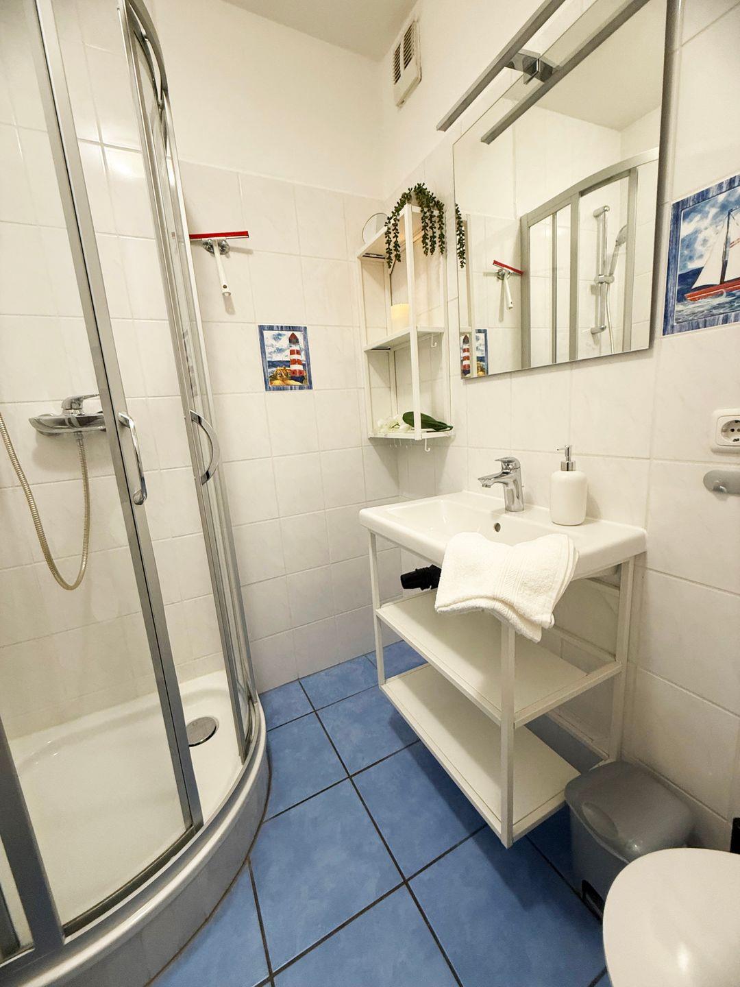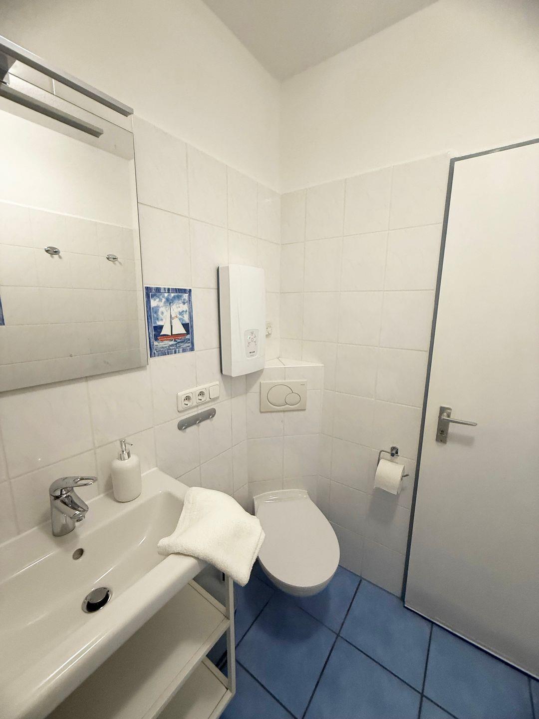 Dusche, Waschbecken, Spiegel, gute Beleuchtung, WC, Regal, Handtuchaufhänger, Fön