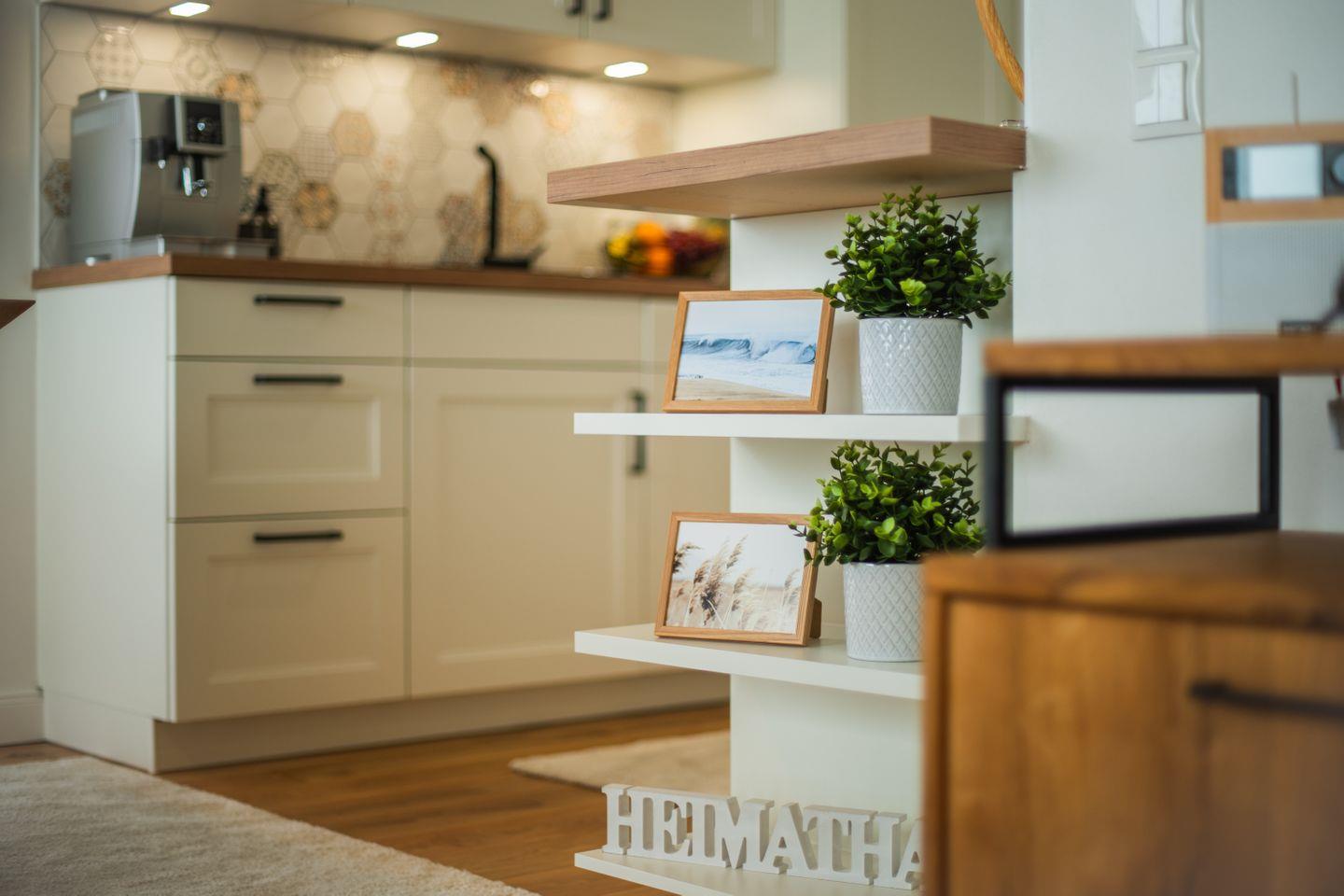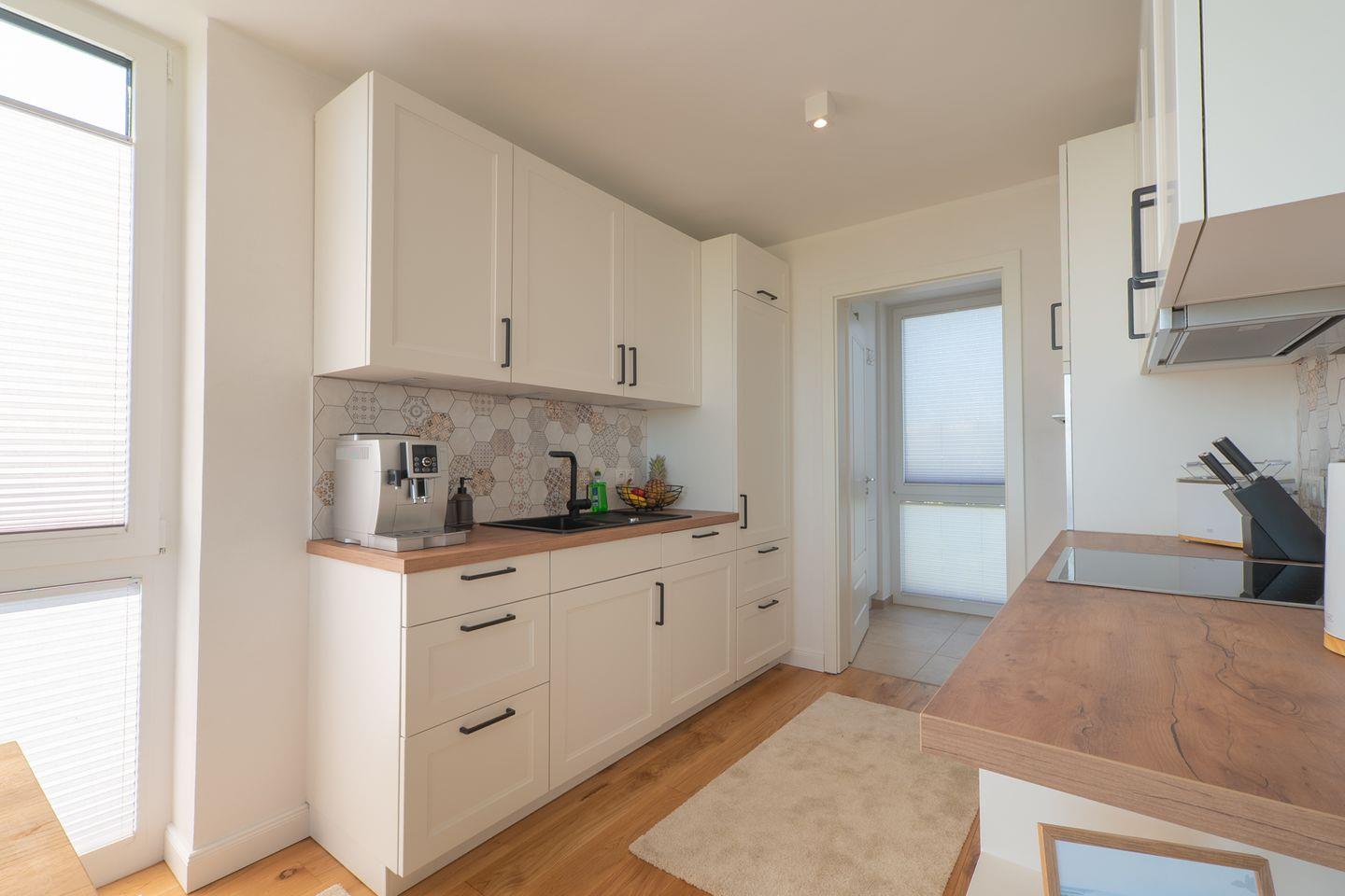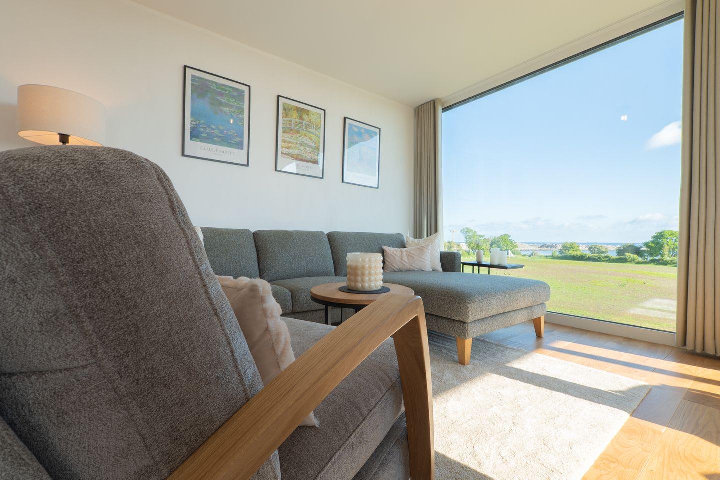 Im lichtdurchfluteten Wohnbereich mit bodentiefen Fenstern genießt du einen uneingeschränkten Blick auf die Ostsee. Hochwertige Möbel, dezente Farben und stilvolle Details schaffen eine gemütliche Atmosphäre. Die offene Küche ist voll ausgestattet – mit Spülmaschine, Mikrowelle, Backofen, Senseo Kaffeemaschine und einem Kaffeevollautomaten für genussvolle Urlaubsmomente.