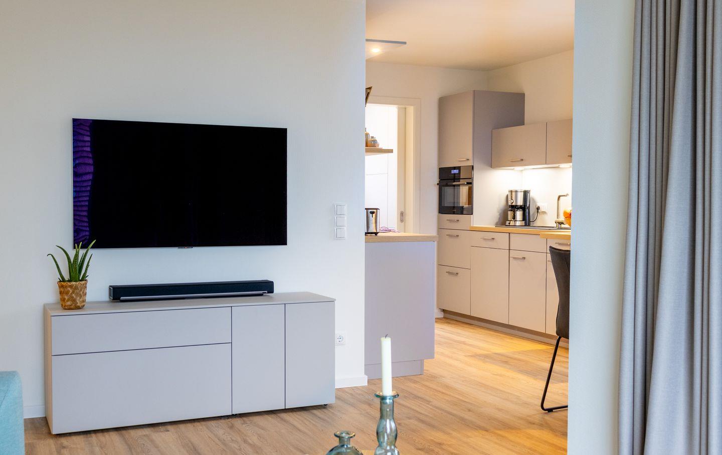 Der offene Wohnbereich ist harmonisch eingerichtet – warme Farben, natürliche Materialien und große Fenster schaffen eine einladende Atmosphäre. Vom Relaxsessel oder der Sofaecke aus blickst du direkt aufs Wasser. Für Unterhaltung sorgt ein großer Smart-TV mit Sprachsteuerung und eine Soundbar.