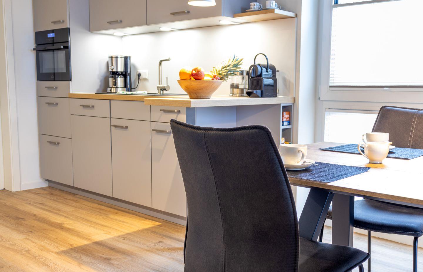Die voll ausgestattete Küche mit Geschirrspüler, Backofen, Mikrowelle, Kaffeemaschine, Nespressomaschine und Sodastream lädt zum Kochen ein (CO2-Zylinder mit Schraubverschluss bitte selbst mitbringen). Der direkte Zugang zur überdachten Terrasse rundet das Raumgefühl ab. Eine Waschmaschine steht dir in einem separaten Bereich zur Verfügung.
