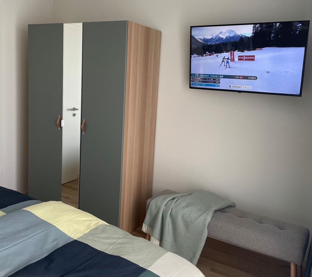 Zwei getrennte Schlafzimmer mit bequemen Boxspringbetten und beruhigendem Farbkonzept sorgen für erholsame Nächte. Große Fenster schaffen eine freundliche Atmosphäre, während moderne TV-Geräte mit Sprachsteuerung den Komfort unterstreichen. Ein Ort zum Ausschlafen, Abschalten und Wohlfühlen. Für Kleinkinder steht ausreichend Platz bereit, ein Babybett kann gestellt werden. Alle Betten sind mit Einzelmatratzen und durchgehenden Toppern ausgestattet.