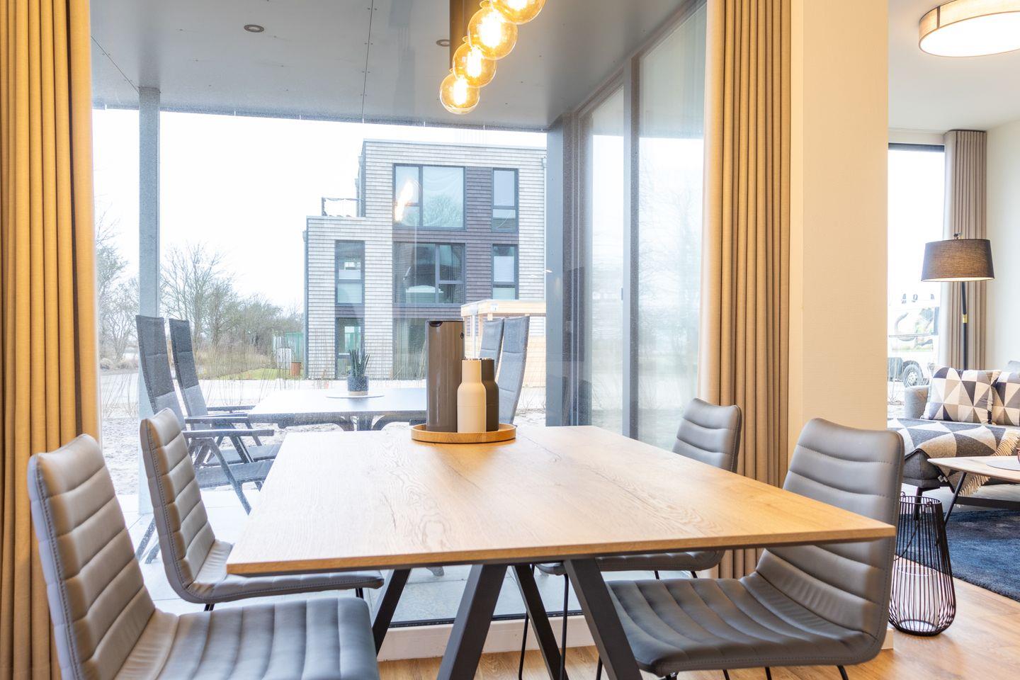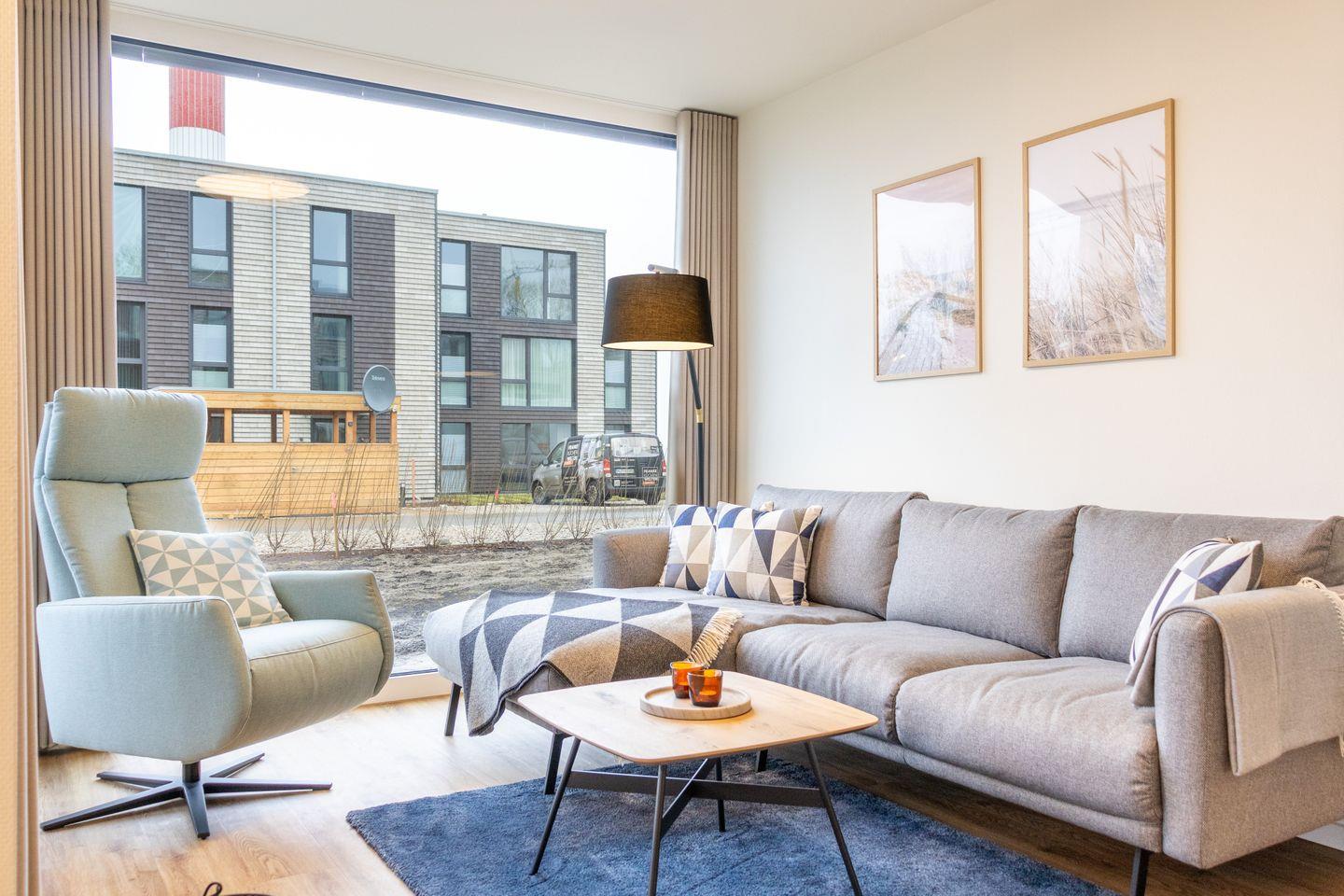 Der lichtdurchflutete Wohnbereich kombiniert dezente Naturtöne mit hochwertigen Materialien. Bodentiefe Fenster öffnen den Blick zur Terrasse und in den Garten. Ein Relaxsessel, ein großer Smart-TV und die offene Küche mit Markengeräten schaffen die perfekte Umgebung für entspannte Stunden. Der Essbereich lädt zu gemeinsamen Mahlzeiten ein – drinnen oder draußen mit Blick auf die Ostsee.