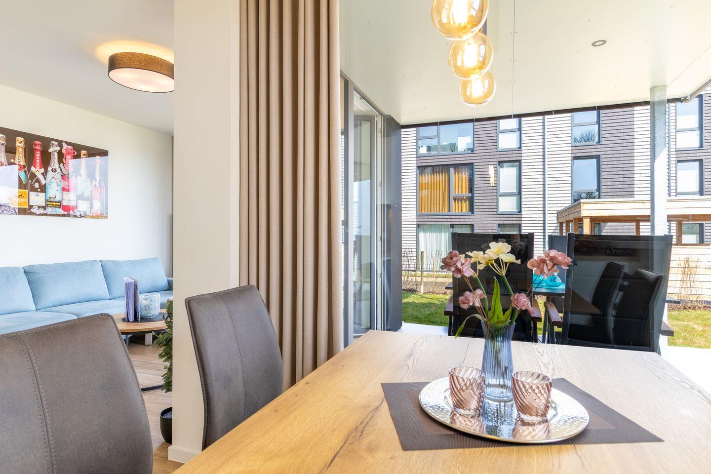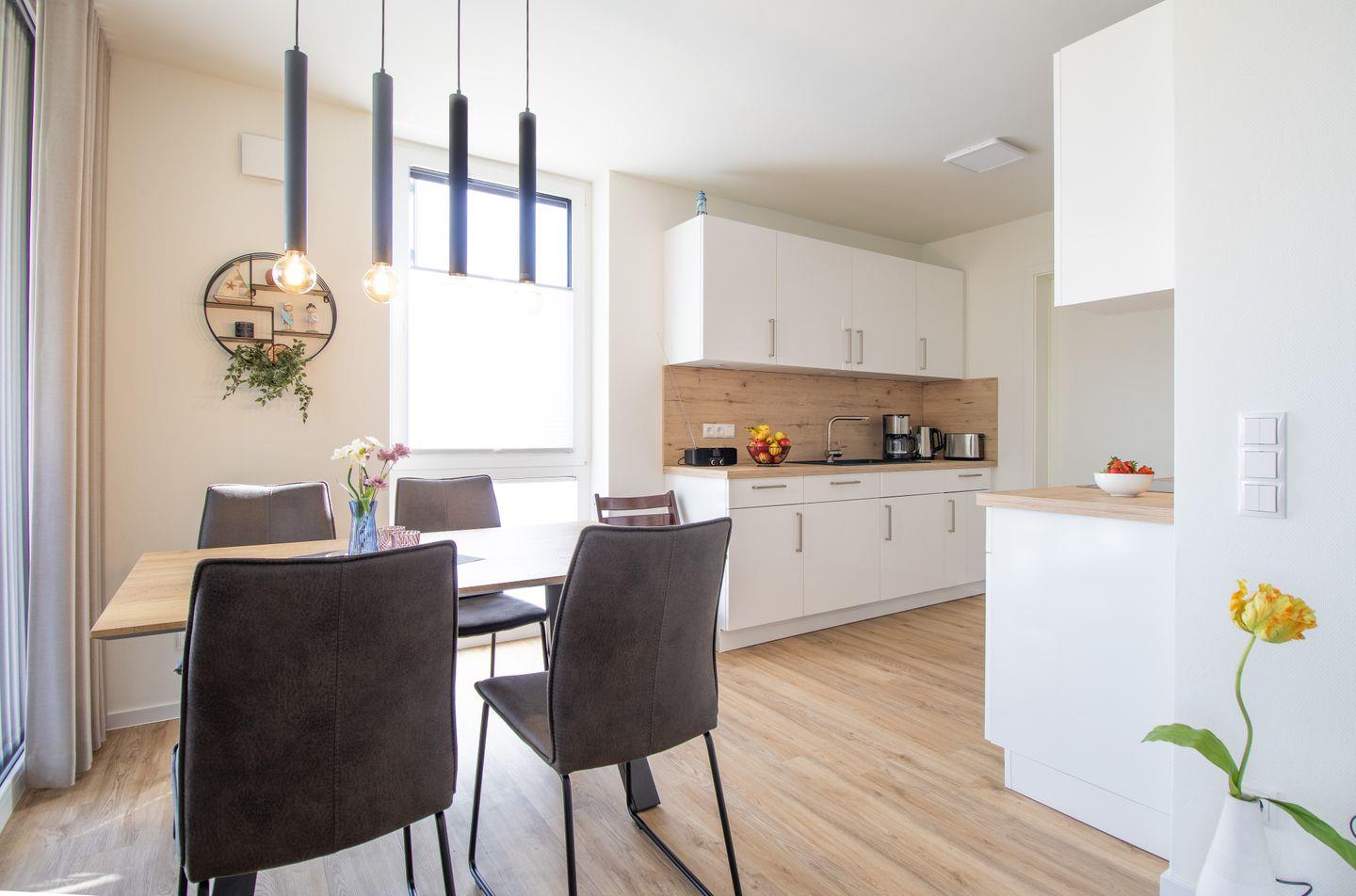 Der offene Wohnbereich verbindet Wohnzimmer, Küche und Essplatz zu einem harmonischen Raumkonzept. Große bodentiefe Fenster lassen viel Licht herein und eröffnen dir den direkten Zugang zur überdachten Terrasse. Die voll ausgestattete Küche mit hochwertigen Markengeräten wie Geschirrspüler, Backofen und Kaffeemaschine lädt zu entspannten Kochabenden ein. Im gemütlichen Wohnbereich mit Smart-TV kannst du dich zurücklehnen und die Seele baumeln lassen – oder gesellige Stunden mit deinen Liebsten verbringen.