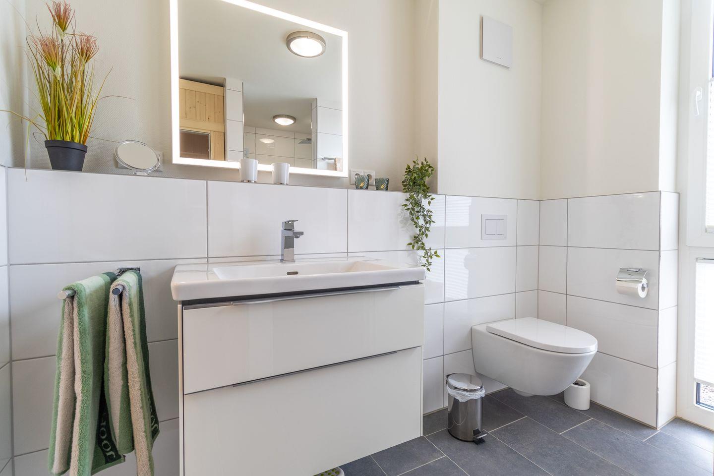 Im stilvoll gestalteten Badezimmer kannst du in deiner eigenen Sauna entspannen und den Alltag hinter dir lassen. Die bodengleiche Dusche bietet dir Erfrischung zu jeder Tageszeit – besonders das Tageslicht macht den Raum zu einem echten Wohlfühlort. Ideal, um entspannt in den Tag zu starten oder ihn ruhig ausklingen zu lassen – bei jedem Wetter.