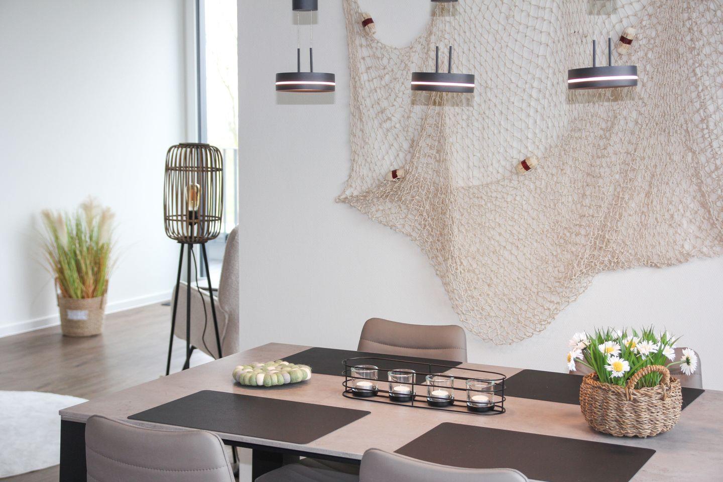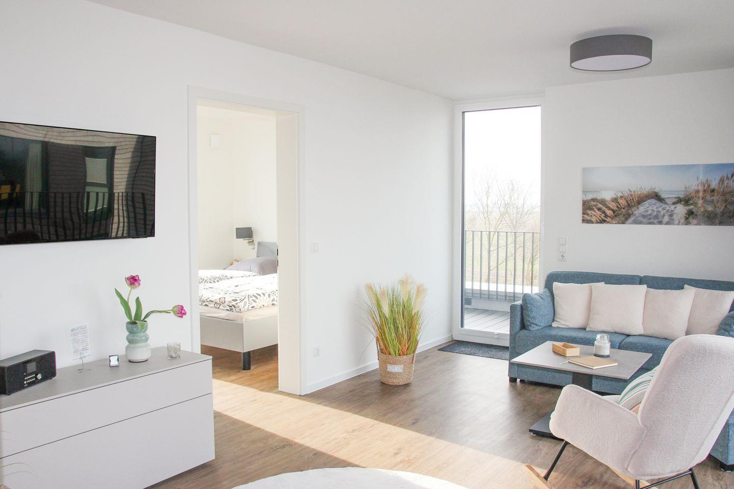 Das Schlafzimmer ist liebevoll eingerichtet und sorgt mit einem hochwertigen Doppelbett, bodentiefen Fenstern, Verdunkelungsmöglichkeiten und sanften Farben für ein harmonisches Raumgefühl. Hier kannst du abschalten, auftanken und die Ruhe genießen – perfekt für deine erholsamen Nächte am Meer.