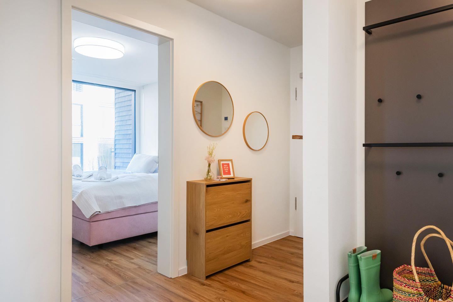 Zwei ruhige Schlafzimmer mit hochwertigen Boxspringbetten und Verdunklungsvorhängen sorgen für erholsame Nächte. Im Hauptschlafzimmer steht dir ein funktionaler Arbeitsplatz zur Verfügung – perfekt für Workation. Die durchdachte Farbgestaltung unterstützt eine entspannte Schlafumgebung.
