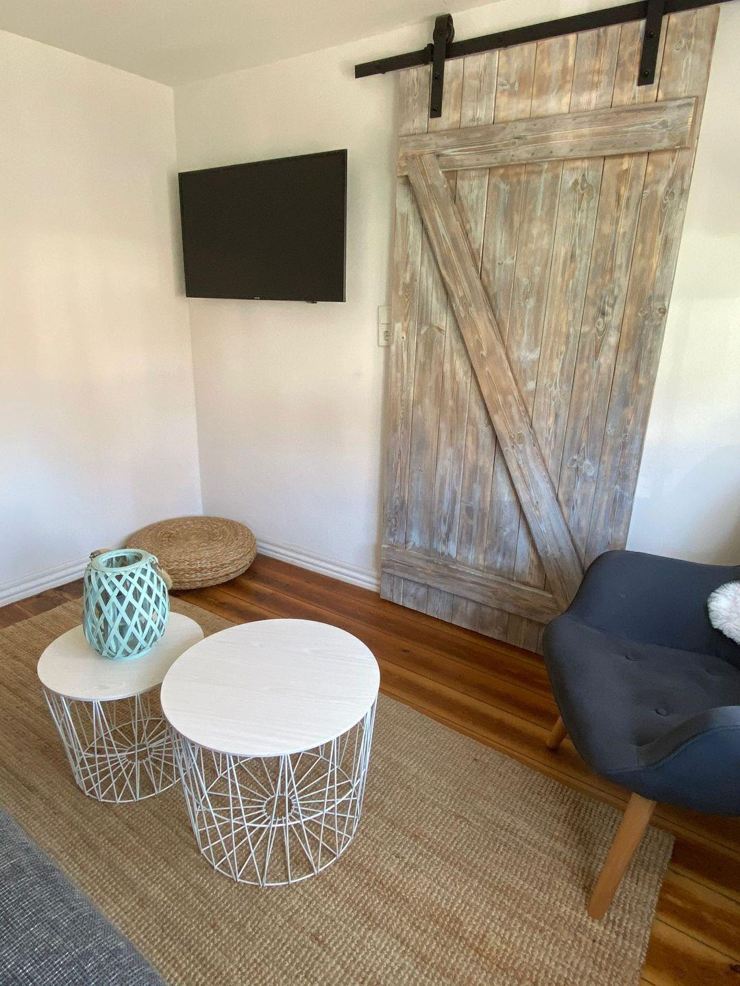 Ein schönes helles Wohnzimmer mit Sitzgarnitur und Flachbildfernseher ist der Mittelpunkt des Hauses.